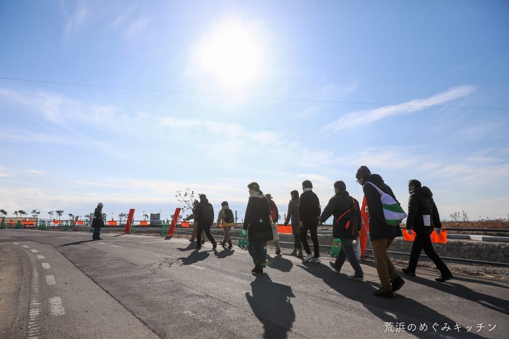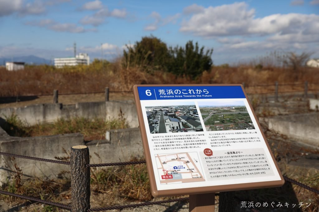 移動の途中で立ち寄ったのは、深沼橋となりの土地。ここはかつては住宅地だった場所。仙台市の防災集団移転跡地利活用事業の中で、私たち荒浜のめぐみキッチンが「深沼ベース(仮称)」として整備・運営する準備を進めています。