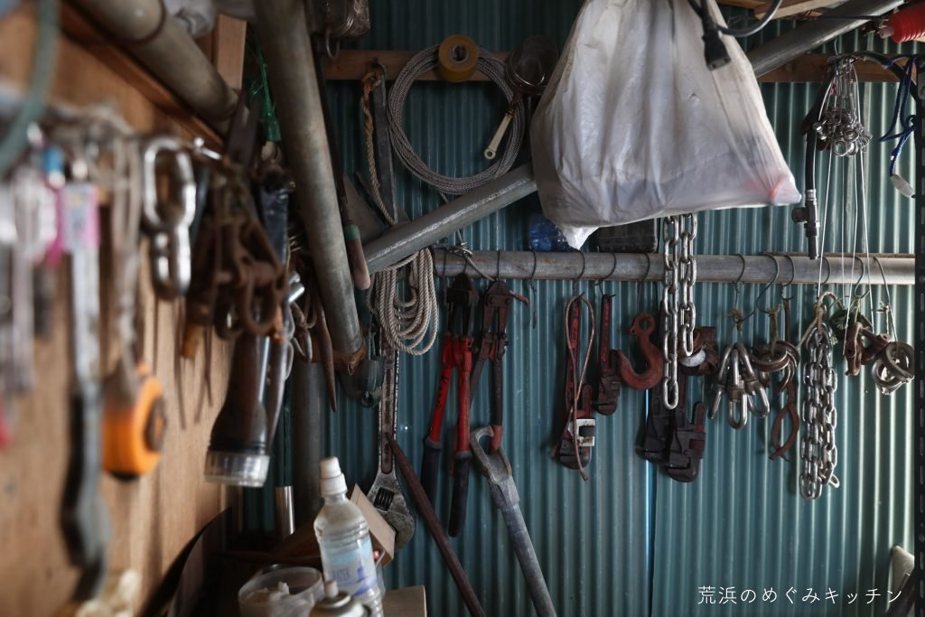 続いてお伺いしたのは、よしおさんの番屋。沿岸漁業を営む「大吉丸」の良男さんが、以前ご自身の運営していた海の家の部材を瓦礫の中から見つけてきたり、海岸の漂着物からも色々と使えそうなものを見つけてきては活用しながらセルフビルドした作業小屋です。