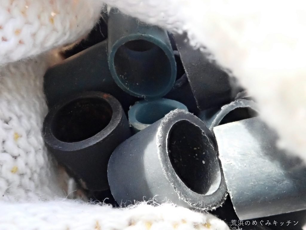 「豆管」と呼ばれる指先くらいの大きさのコレは、牡蠣の養殖に使うものなので、別に回収して再利用します。