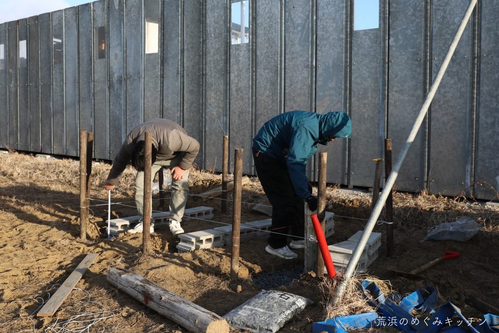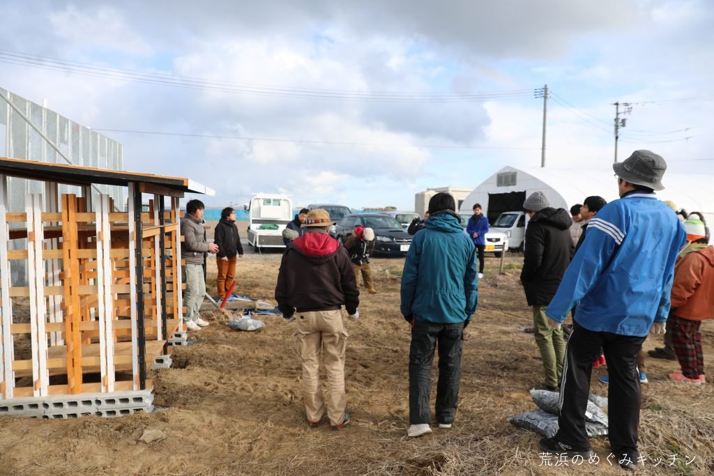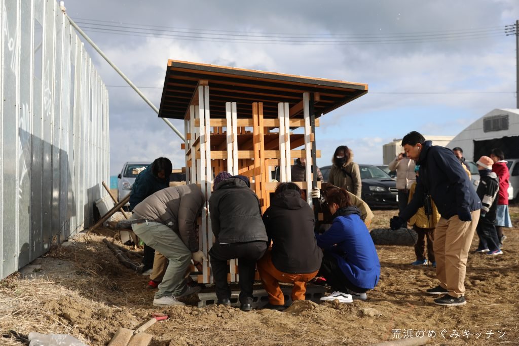 荒浜ベースに薪小屋を作る連続ワークショップ「焚き火と薪小屋づくり」第3回、いよいよ今回は荒浜ベースに薪小屋を立ち上げます。