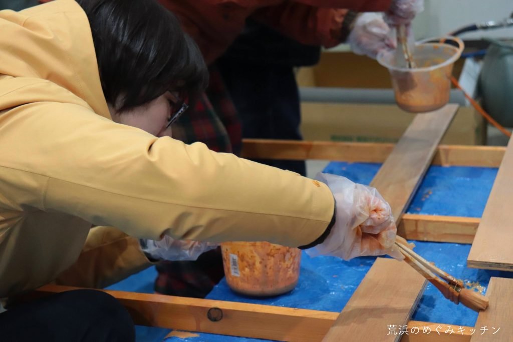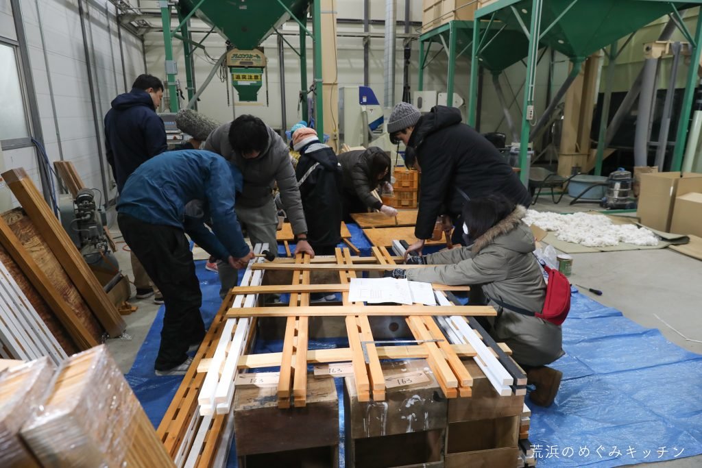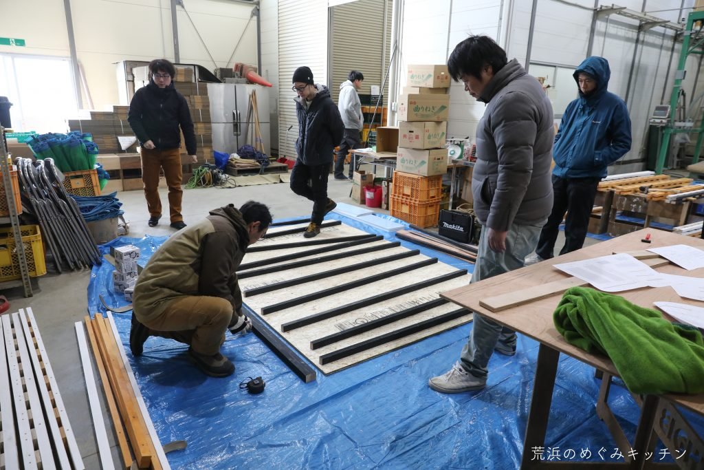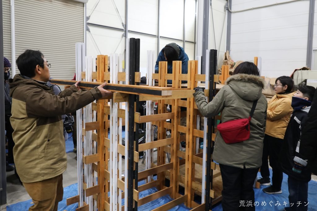 イベント開始前の朝。気温はマイナス、雪が少しちらつく中、先日の朝活で設置した基礎をスタッフで再調整しました。砕石を足したり減らしたりしながら細かく水平出し。