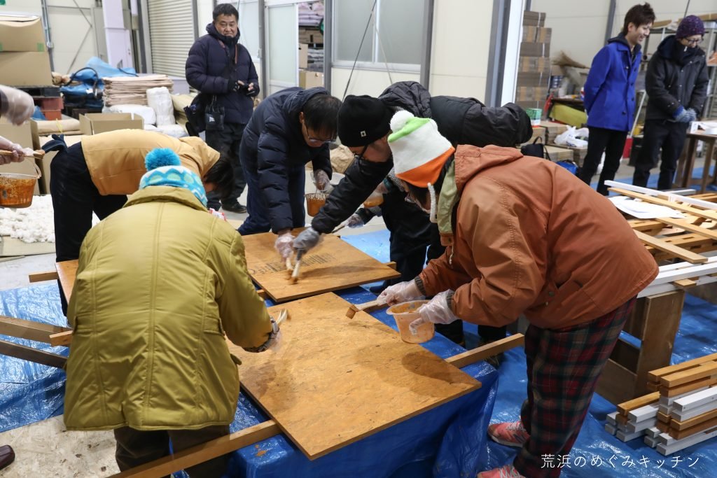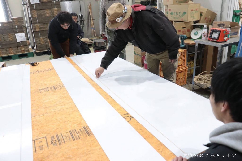 午後も二手に分かれて作業を続行。屋根チームはベースにアルミ複合板を貼りつけていきます。これも廃材の再利用。