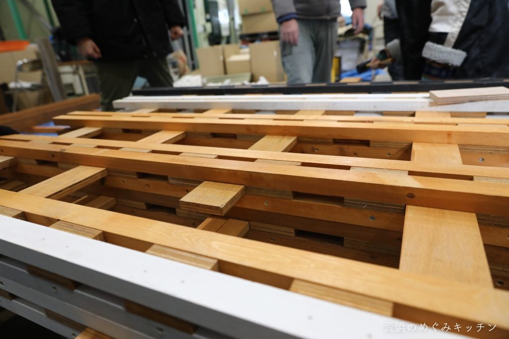 そしてこちらでは壁同士を連結して、床を張りながら本体を組み上げていきます。