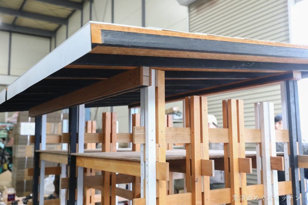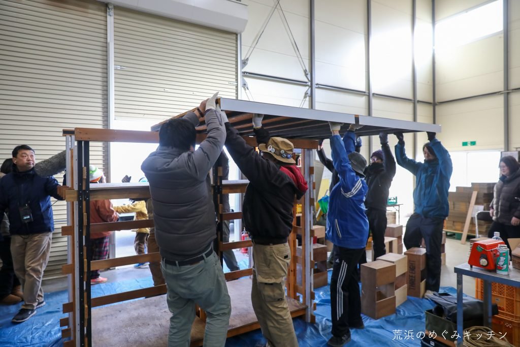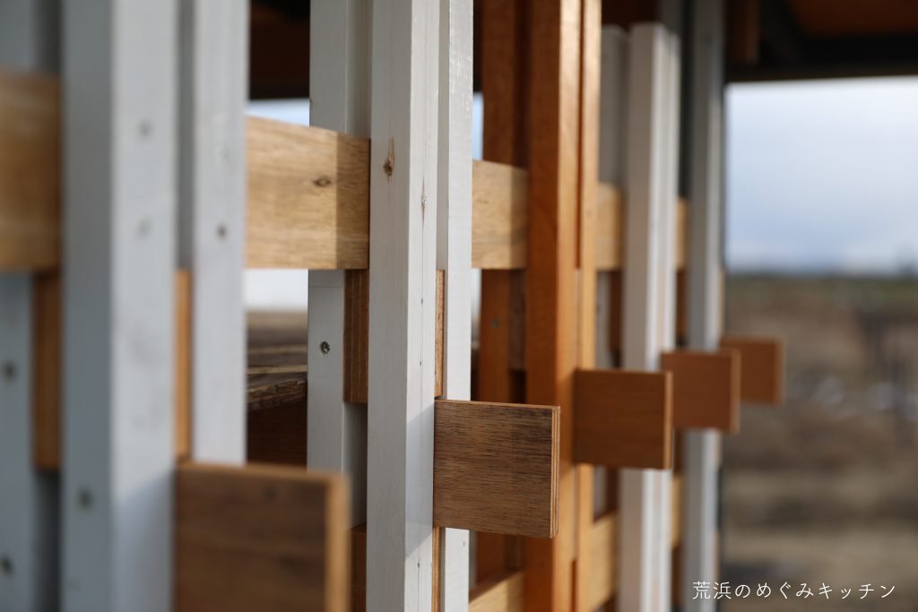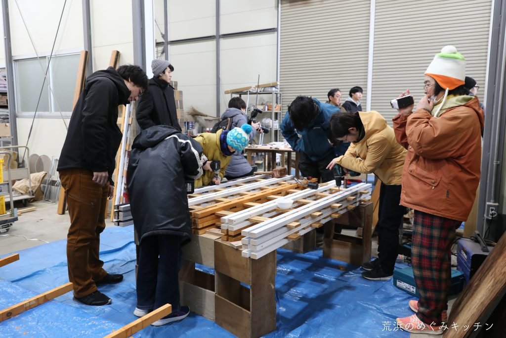 こちらは屋根の枠の組み立て。廃材を活用するため、材料に合わせて微妙に寸法を工夫しています。位置に気を付けながら丁寧に角材を組み合わせていく。