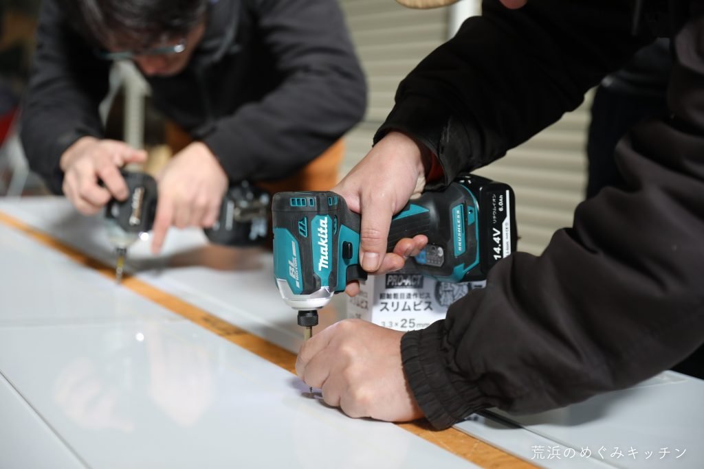 後半に進むほど難易度の高めなビス打ちの場面が増えていき、プロの技が際立ちます。初心者の人も、自分でやってみた後に改めてプロの技を見ると、「やっぱり凄い」と実感させられます。笑