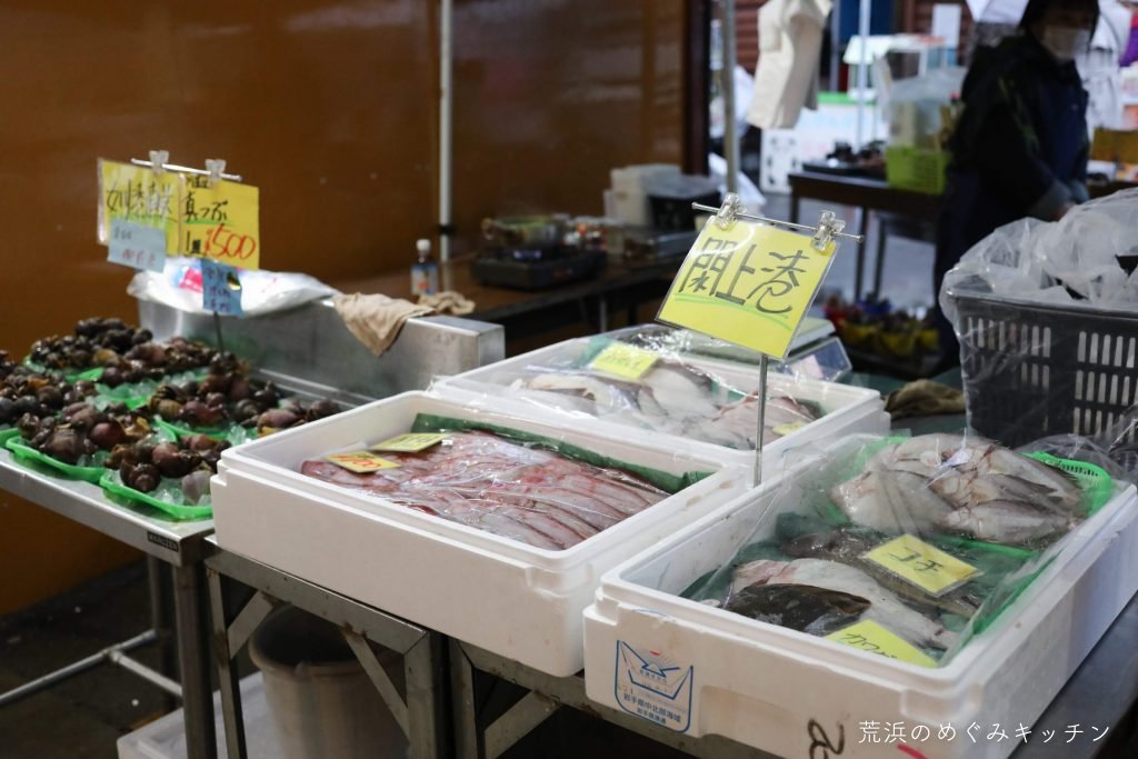 ここの朝市では、魚介に限らず野菜やお惣菜など色々なものが売られています。セリ鍋やお蕎麦などその場で食べられるものも売っていて、みぞれの降る寒い朝には大変魅力的。笑