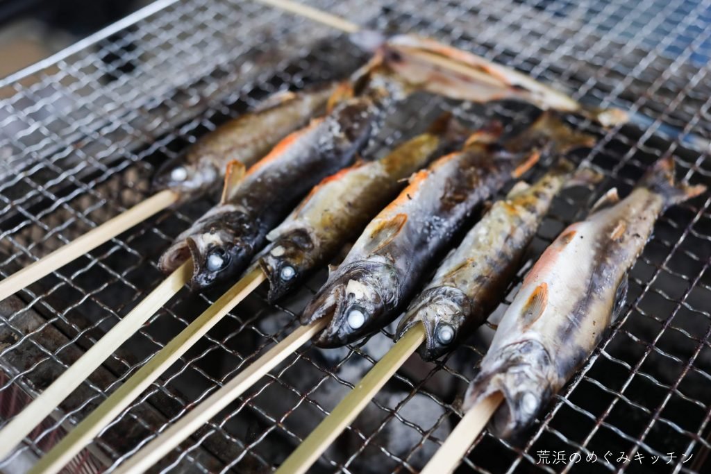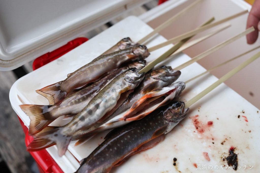 荒浜ベースに戻って朝食の準備。朝活にいつも来てくれている方が、昨日釣ったばかりのイワナとヤマメを差し入れてくれました。こちらは塩をふって串焼きにします。