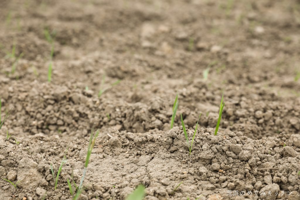 ところで今年は、田んぼの近くで小麦の栽培にもチャレンジしています。先日撒いた種が小さな芽を出していました。