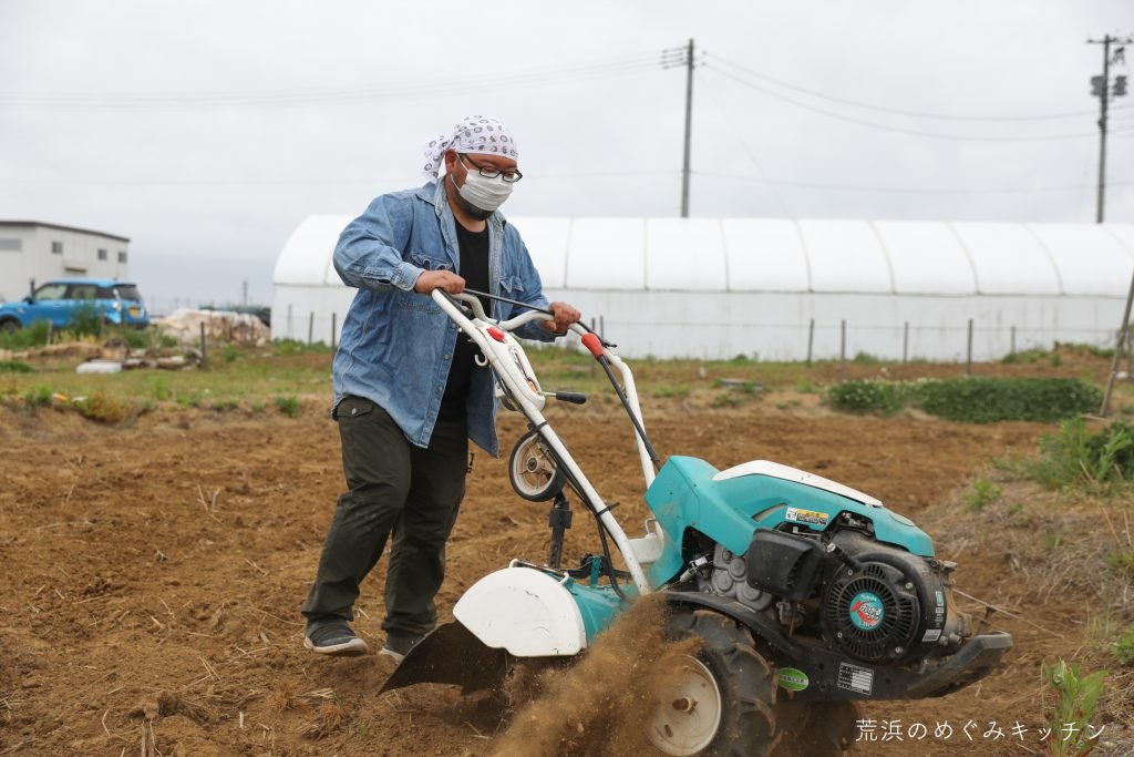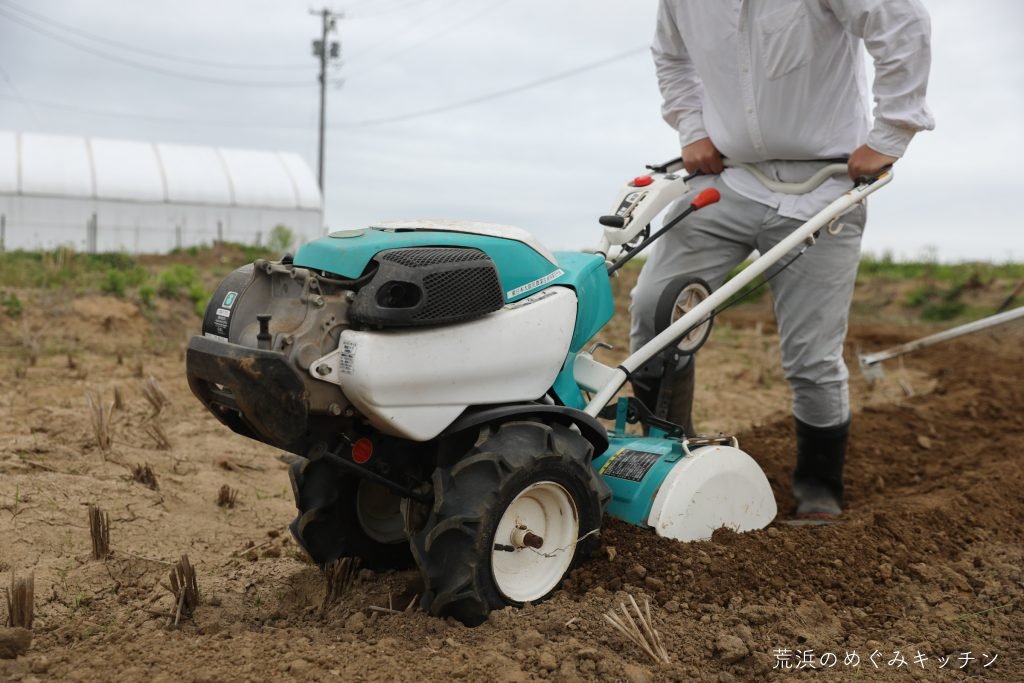 今日の主な作業は「耕耘(こううん)」で、固まってしまった土を細かく砕きながら掘り返し、あとで稲が根を張りやすいように整える工程です。今回は小型の耕耘機のお世話になりました。