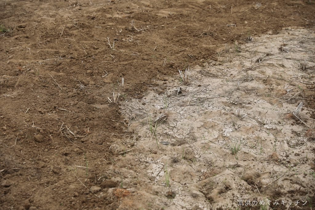 耕耘機をかける前(右)と後(左)。固かった地面がフカフカになっていきます。