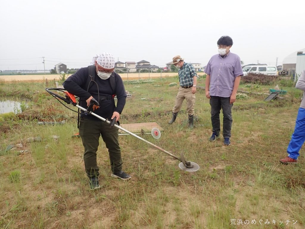 さすがにすべて手作業では大変なので、草刈り機も登場。まずはみんなでレクチャーを受けます。