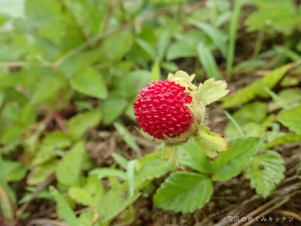 田んぼの脇にはヘビイチゴの実がなっていました。