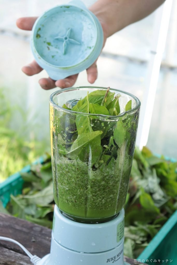 ここからは染め液の準備。茎から葉をとり、ミキサーに水と一緒に入れて細かく刻んでいきます。