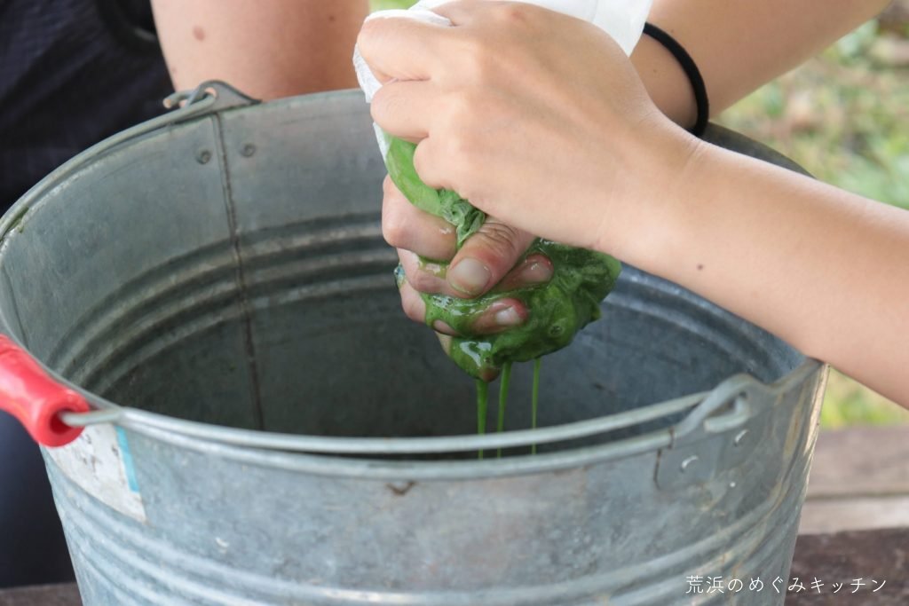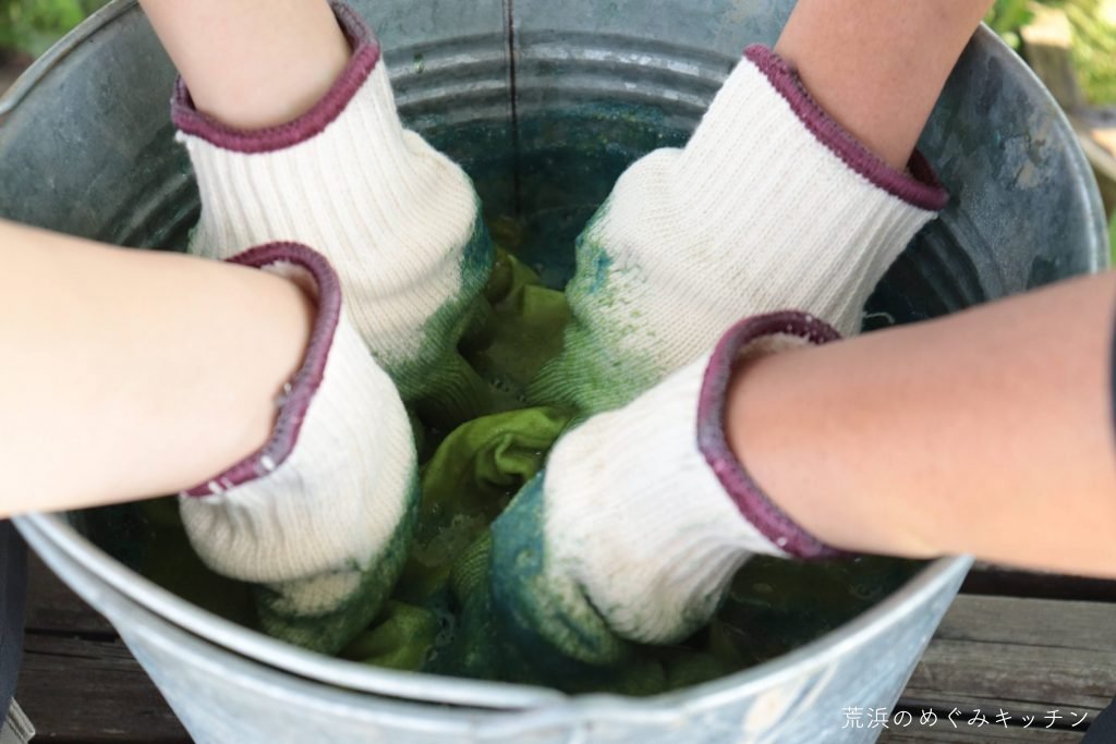 それを不織布で漉しながら絞り、バケツに溜めます。今回は植物性繊維を染めるので、PHをアルカリ性にするための消石灰と、還元剤としてハイドロサルファイトを投入しました(いずれは化学薬品に頼ることなく染められるように計画中です)。