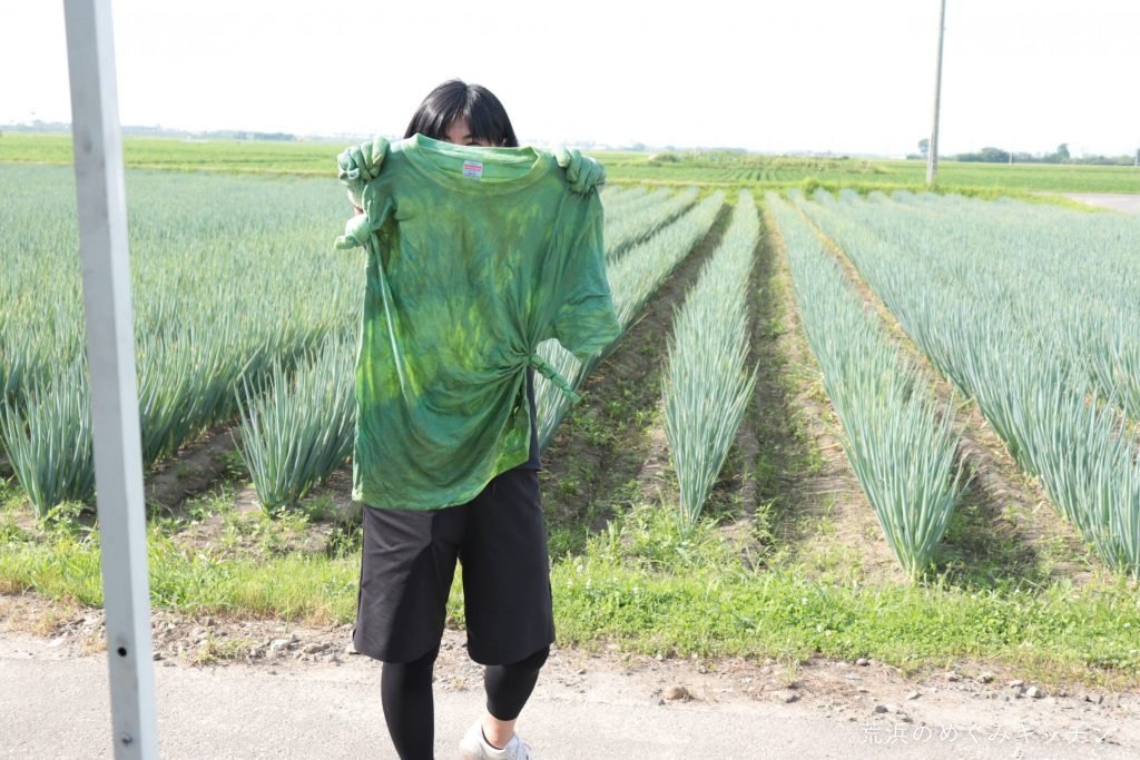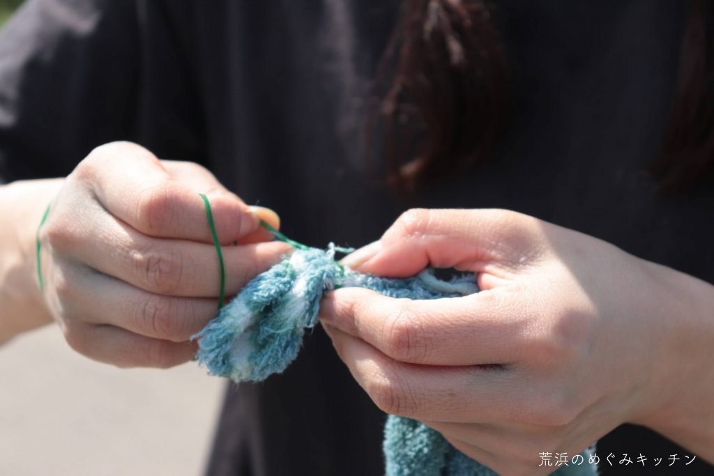 今回は木綿のTシャツ、タオル、大判の布、ドレスシャツなど、それぞれが染めたいものを持ち込みました。出来上がりの模様を想像しながら、ところどころ輪ゴムで縛っていきます。縛り終えたら、水に浸して繊維に染め液が入りやすいように準備します。