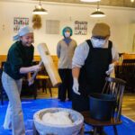 今回は木綿のTシャツ、タオル、大判の布、ドレスシャツなど、それぞれが染めたいものを持ち込みました。出来上がりの模様を想像しながら、ところどころ輪ゴムで縛っていきます。縛り終えたら、水に浸して繊維に染め液が入りやすいように準備します。