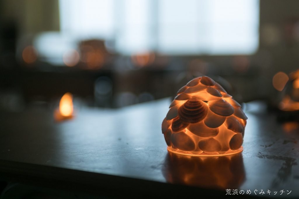 土地のめぐみをお腹いっぱいいただいたあとは、午前中に拾った海のめぐみを使って、キャンドルホルダーづくりに挑戦していただきます。
