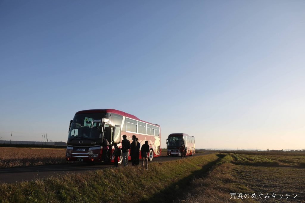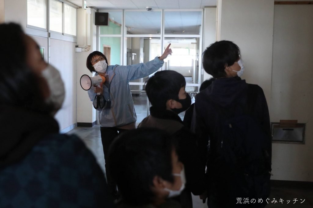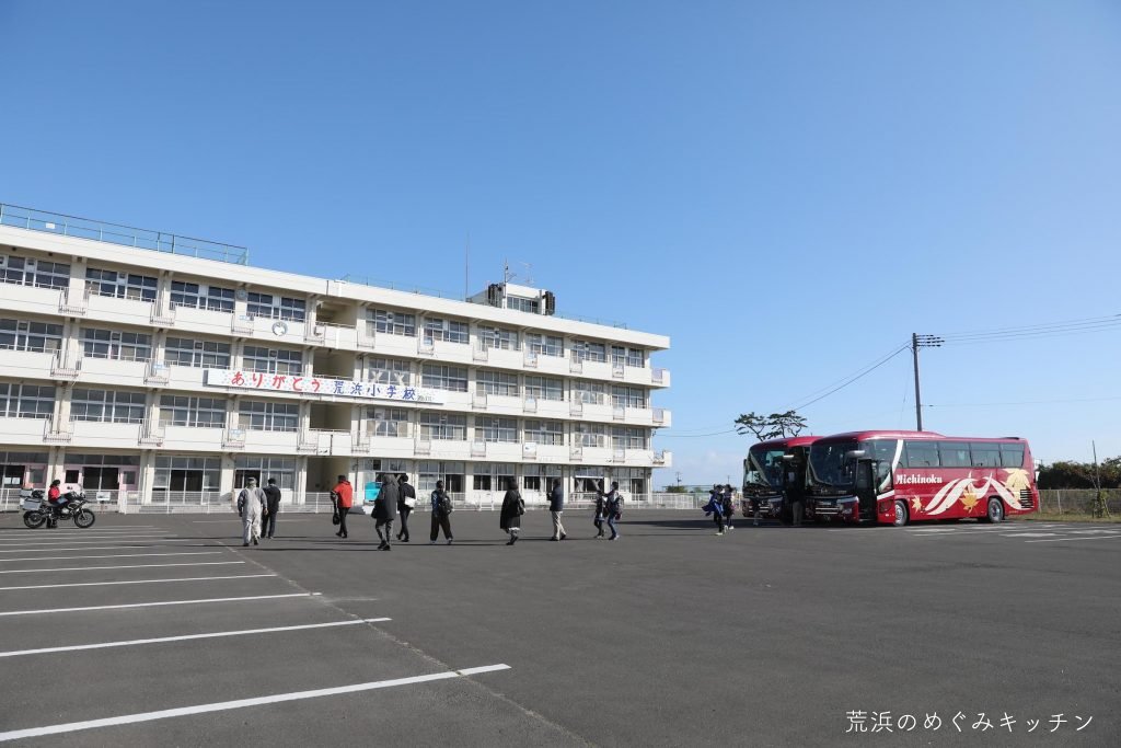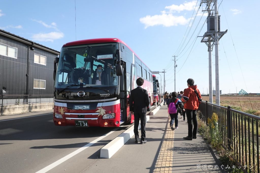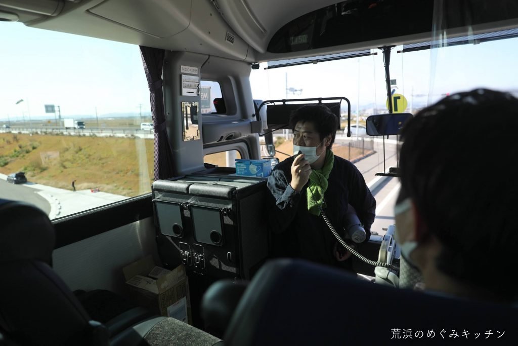 再びバスに乗って内陸へ。荒浜の文化や地域で活動を続けていらっしゃる様々な方についてもお話しながら、めぐみキッチンの荒浜ベースへ向かいます。