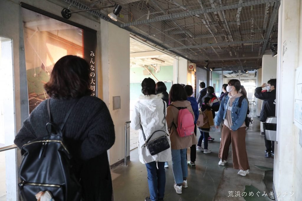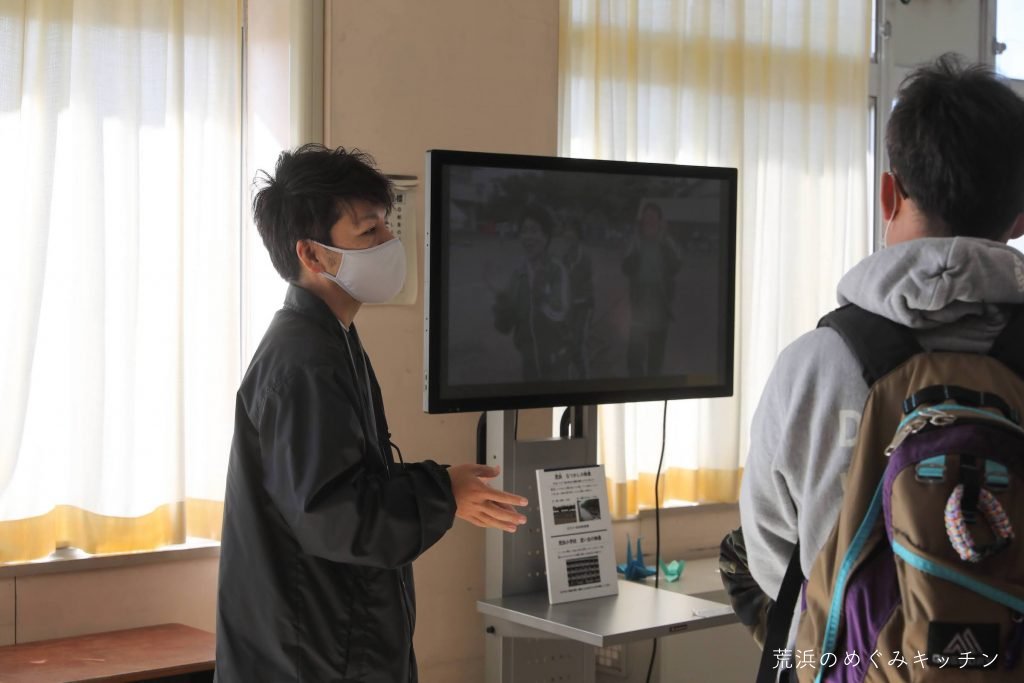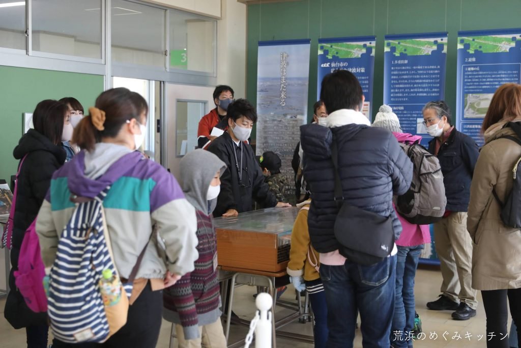 荒浜の地を知る上では欠かすことのできない、東日本大震災の話。案内スタッフの方に直接お話しいただきながら、館内を見学しました。