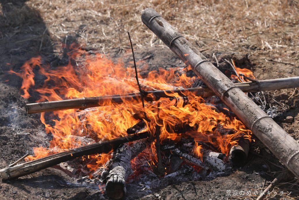 荒浜ベースでは焚き火がお迎え。お昼ご飯の時間です。