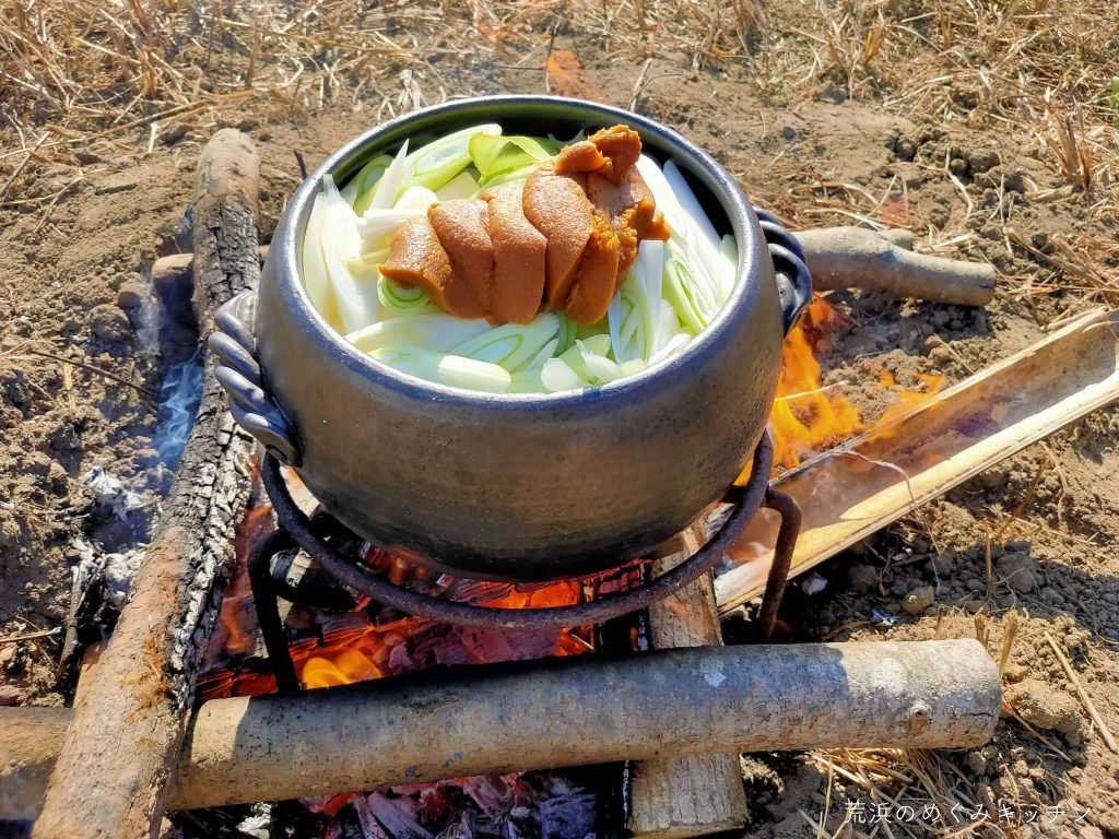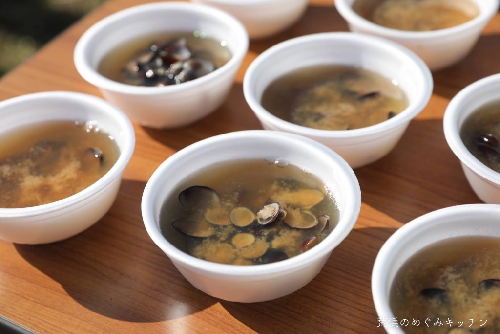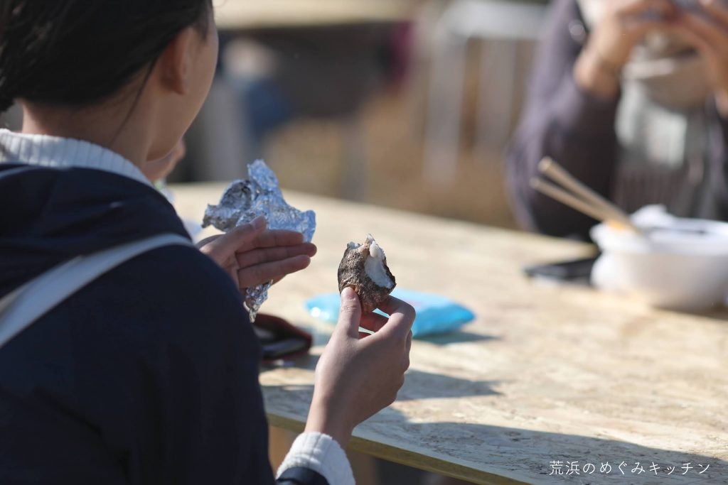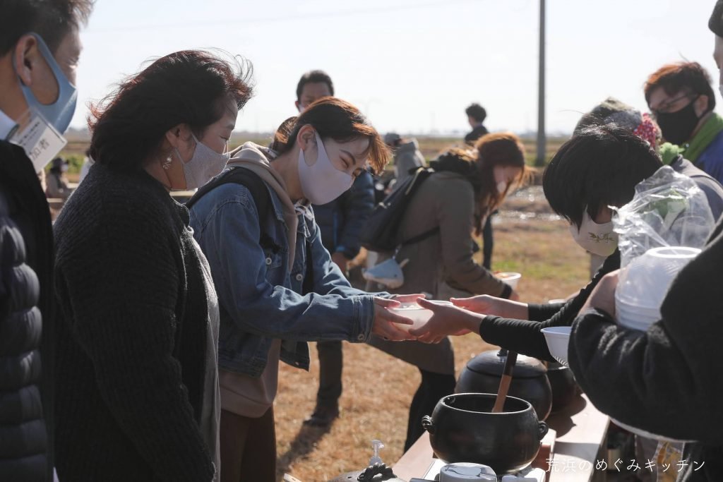 焚き火と土鍋で炊いた荒浜の新米やネギ味噌、かつて荒浜の貞山運河で漁が盛んだったシジミの汁物などをお振る舞いしました。