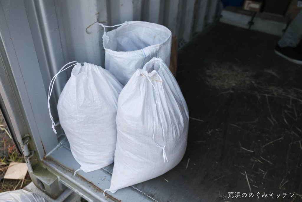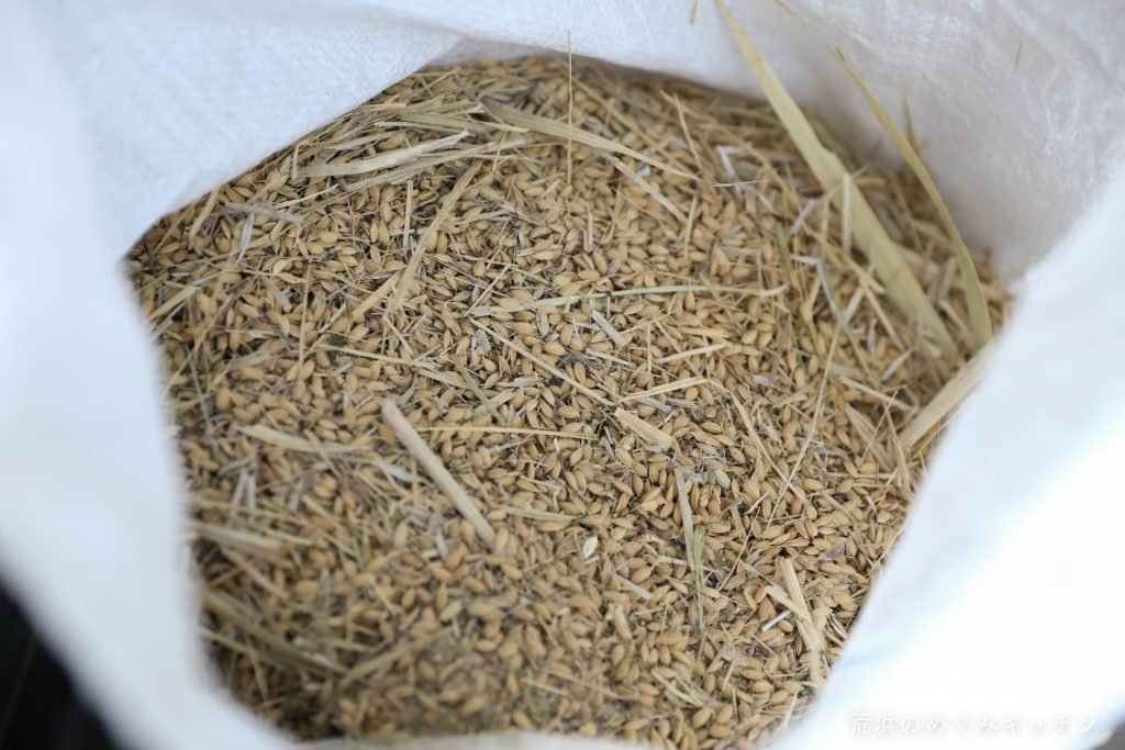 脱穀された籾(もみ)。田んぼ作り最初の年は完全手作業でやってみてましたが、農機具の素晴らしさに圧倒されます。100倍以上速い。笑