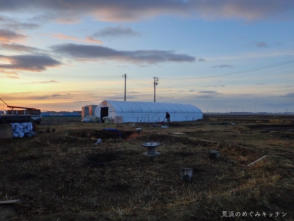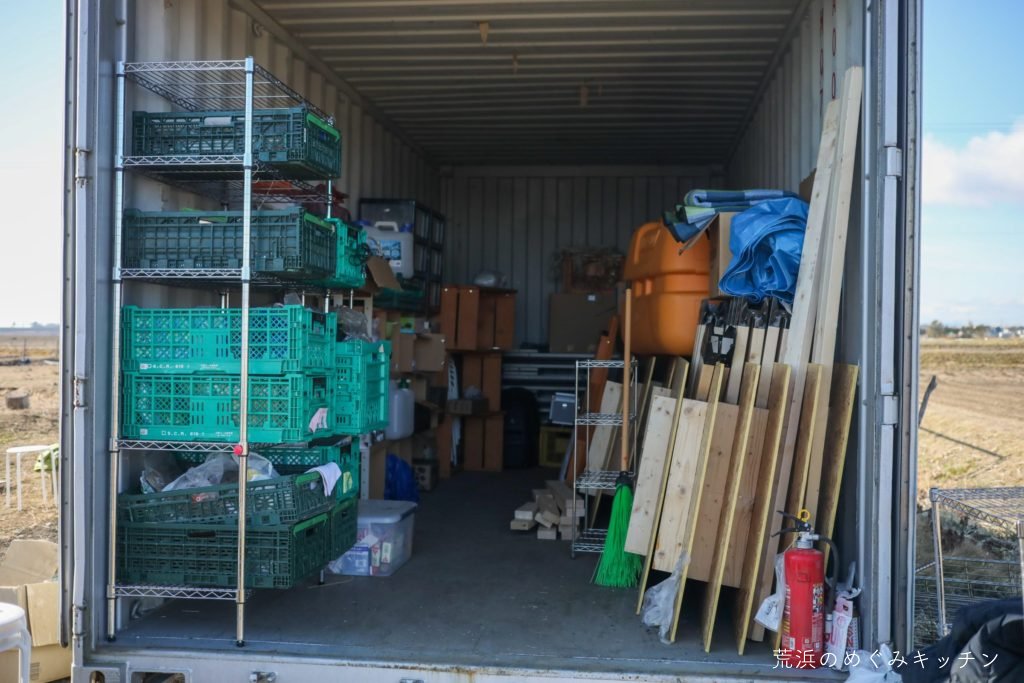 今日のメイン作業は荷物の移動。めぐみキッチンの荒浜ベースは荒浜アグリパートナーズの敷地内にあり、これまで荷物の一部を農業ハウスの中に置かせていただいていましたが、場所が必要になったということで&コンテナも使えるようになったので、大きなものから移動させていきます。