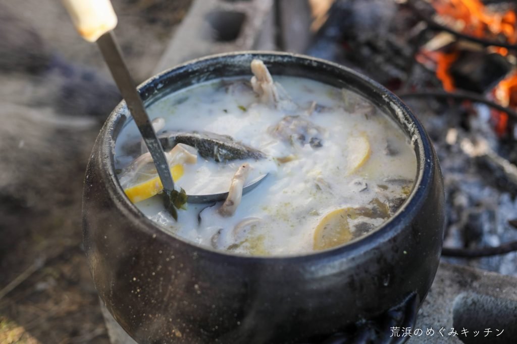 最近の朝活で徐々に再開している朝食。作業の横で焚き火をたいてスープが作られていく…