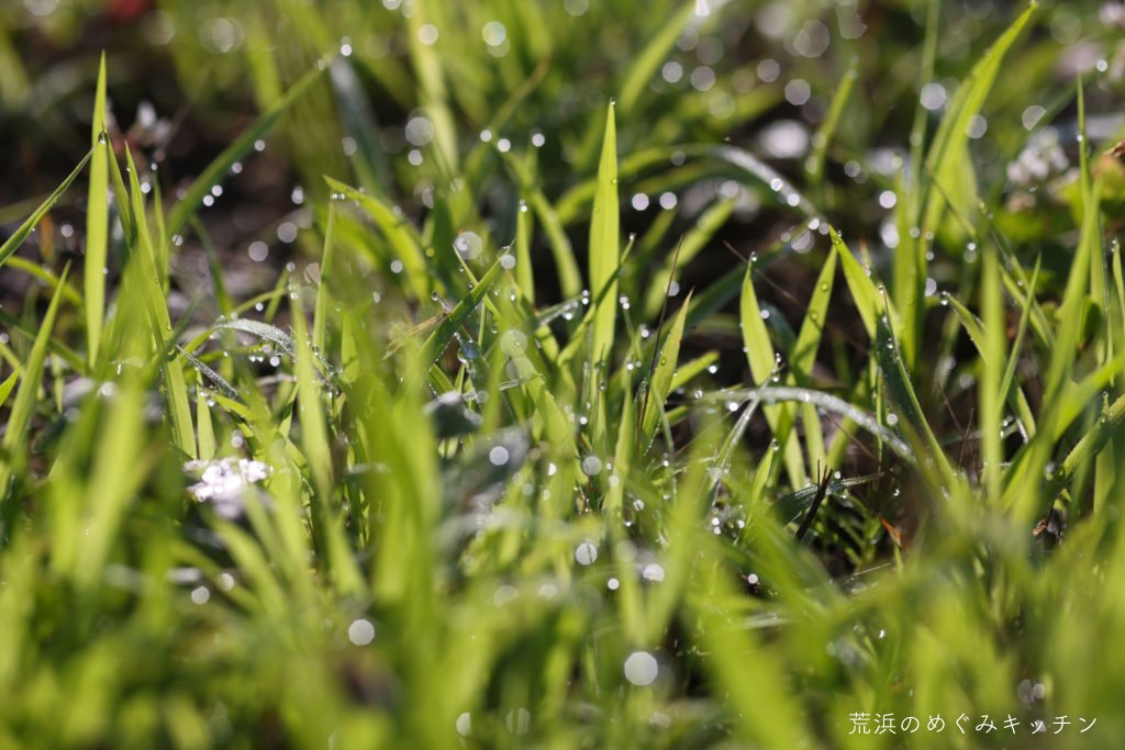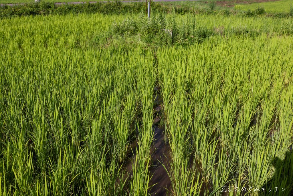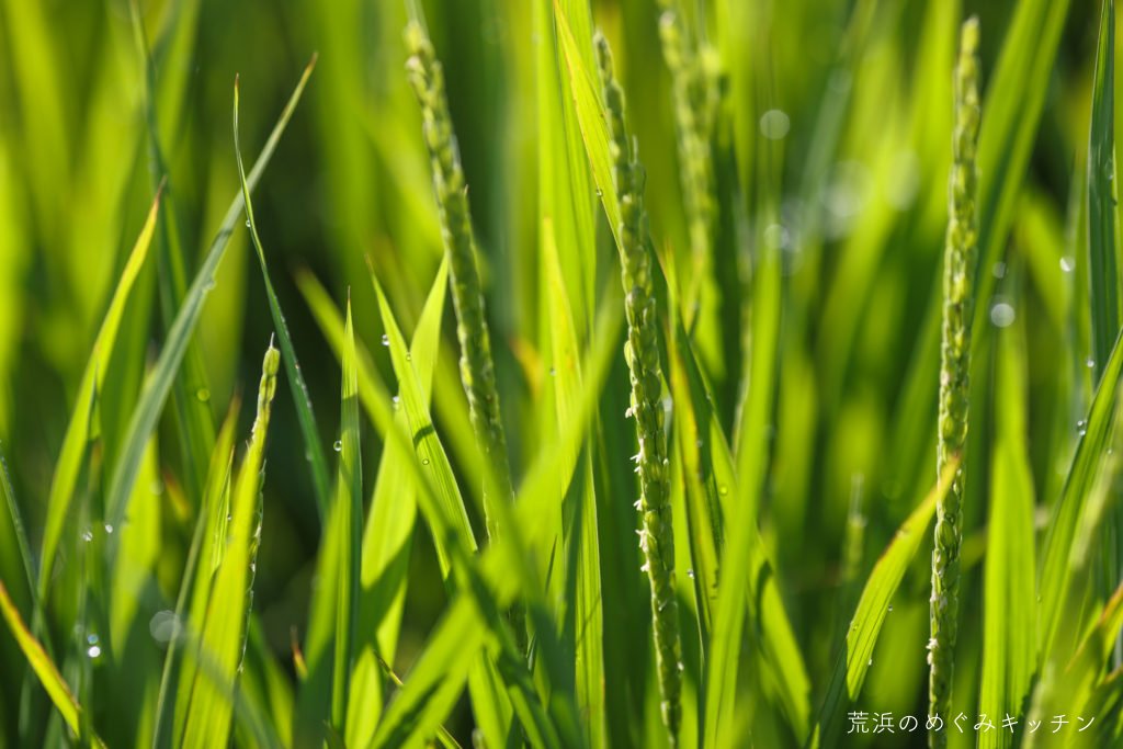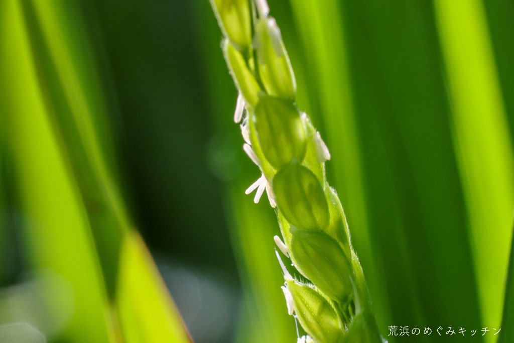 荒浜ベースがある地域には、たくさんの田んぼが広がっています。丸い田んぼは植えたのが遅くまだまだですが、周囲の田んぼでは少しずつイネの花が咲き始めていました。小さな花が朝陽で輝き美しい。