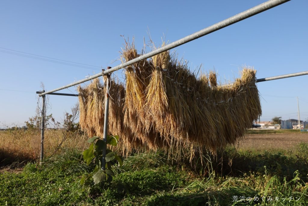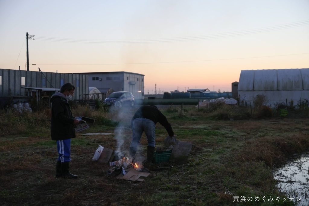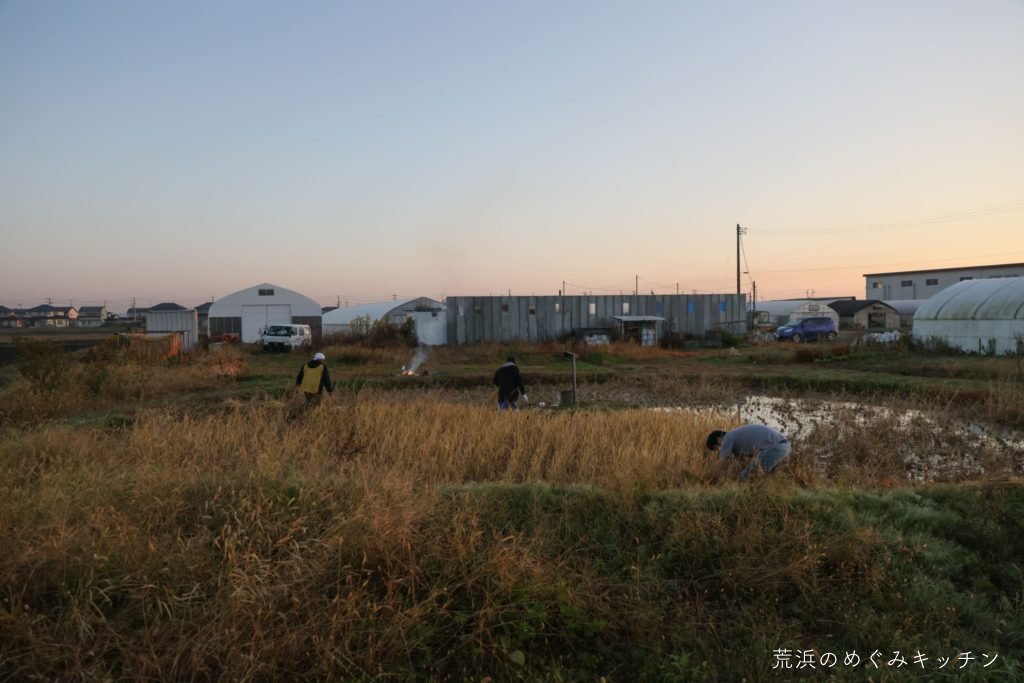 焚き火で暖を取る季節。今日は先週に引き続き、ちょっとだけ残っていた稲を刈り取ります。