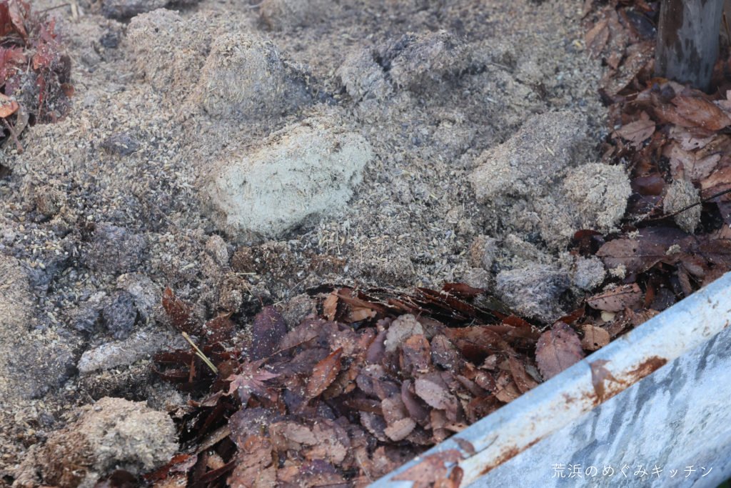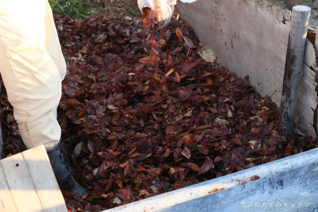 今日の朝活は腐葉土作り。ご厚意で卸町から頂いてきた落ち葉に、稲の籾殻を混ぜながら積み上げていきます。