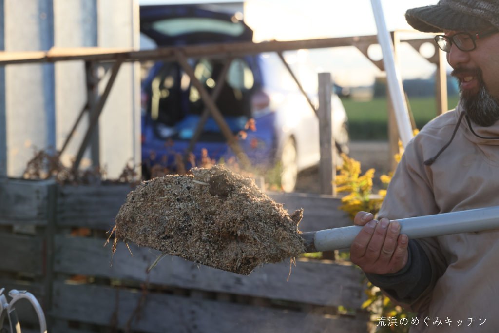 事前に貯めておいた(少しお米混じりの)籾殻が発酵して、湯気が上がる。