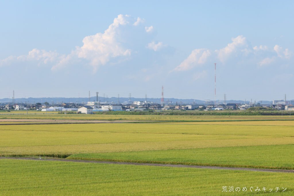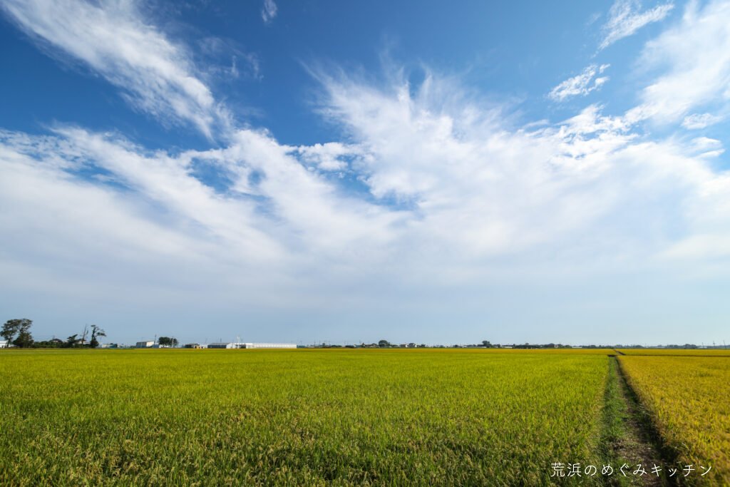 荒浜の空気を感じながら、夕方、夜へと移り行く空を眺める… そんなイベントを少しでも追体験できるよう、午後から日暮れまでの時間をかけて朗読を撮影しています。また荒浜地区の色々な場所、イネの花が咲く頃から秋に至るまで、さまざまな情景を折り込みました。