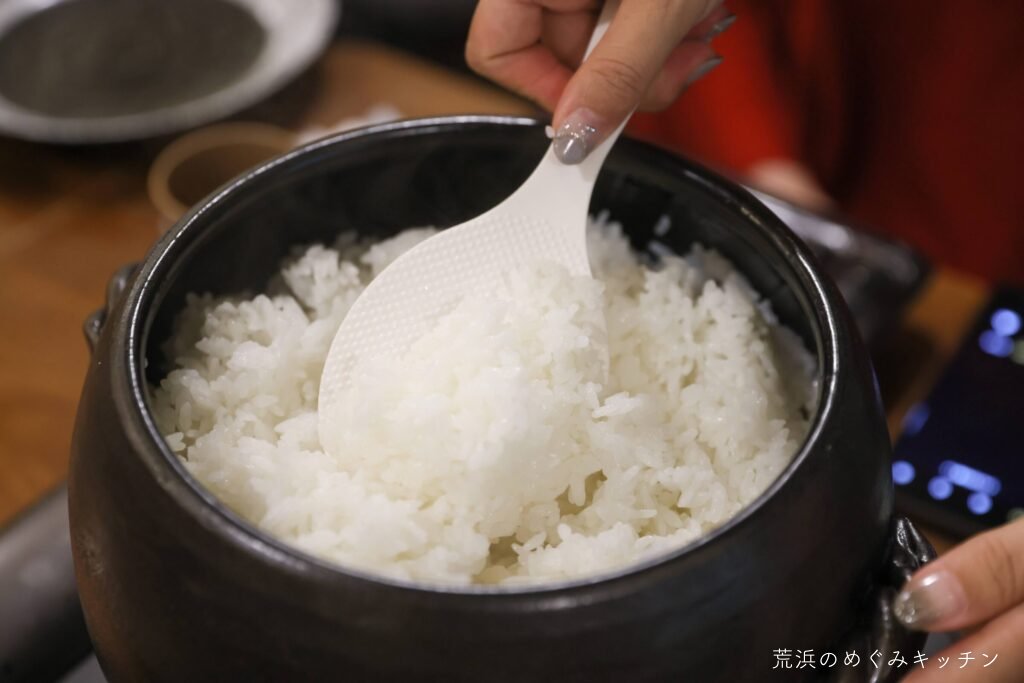 お米が炊き上がりました。お米は全部で3種類、①丸い田んぼの去年、②丸い田んぼの今年、そして③荒浜アグリパートナーズのぽんぽこ米。