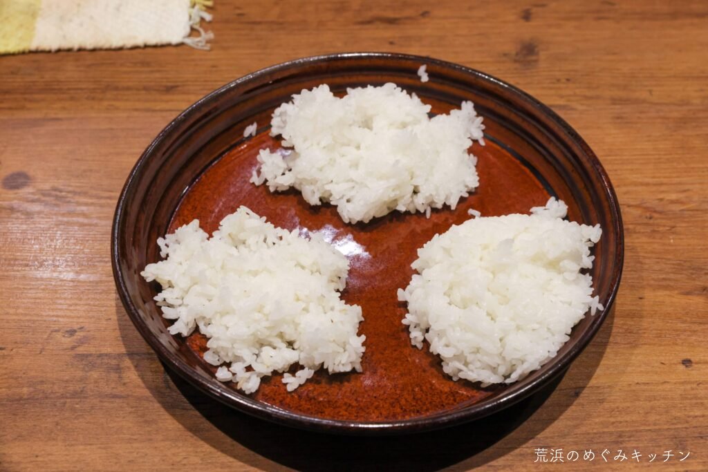 お米そのままで、お惣菜と一緒に、そして綴のカレーと一緒に食べ比べてみました。正直、かなり僅差で、好みによってどれが一番かが分かれるくらい。そして何より、どれもとても美味しい。