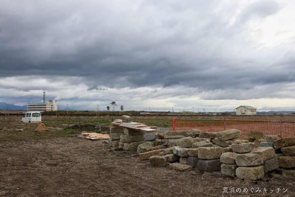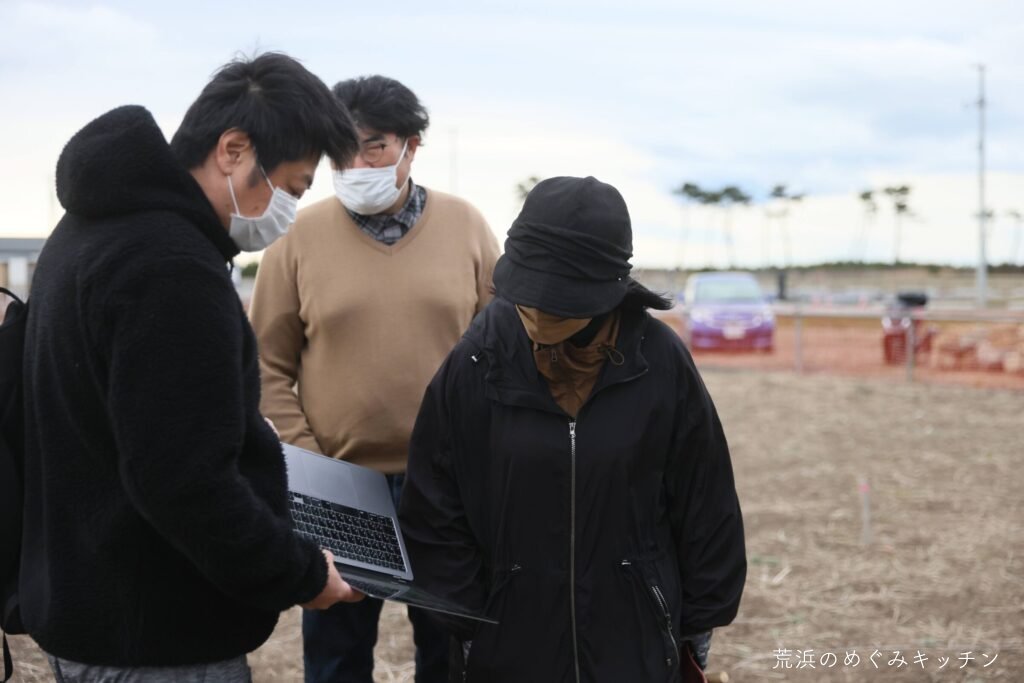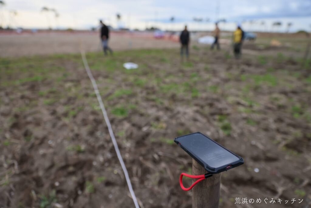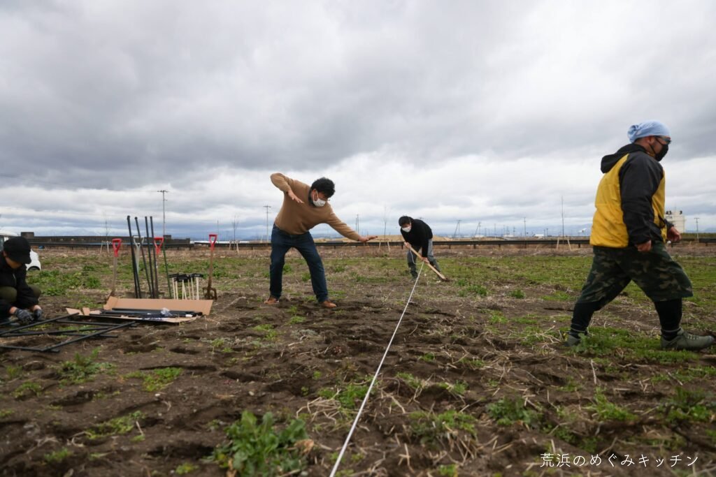 敷地の図面を確認しつつレイアウトを考える。荒浜ベースの田んぼみたいに丸い形に並べてみようと、簡易的に角度を測りながら円を描く。