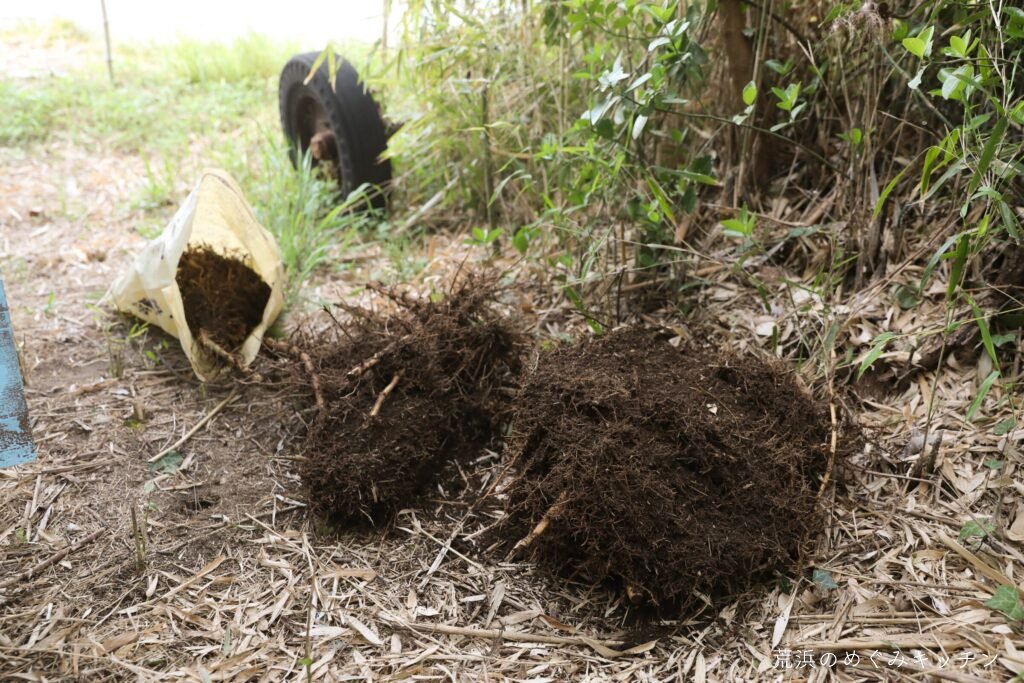 やっと姿を現した竹の根も、長ーく繋がっているのでそのままでは取り出せません。ノコギリで前後を切断して、ようやく摘出。