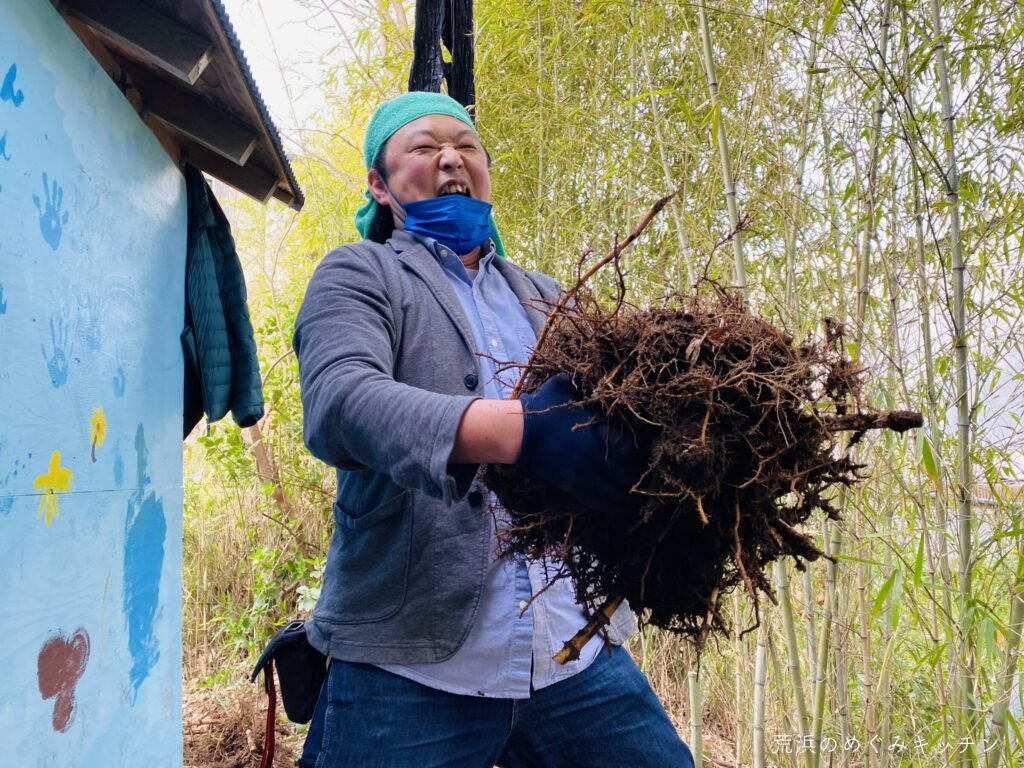 移植のため、さっそく竹の根を掘り始めます。あまり深くもなく、そこら中に張り巡らされているので見つけるのは簡単。