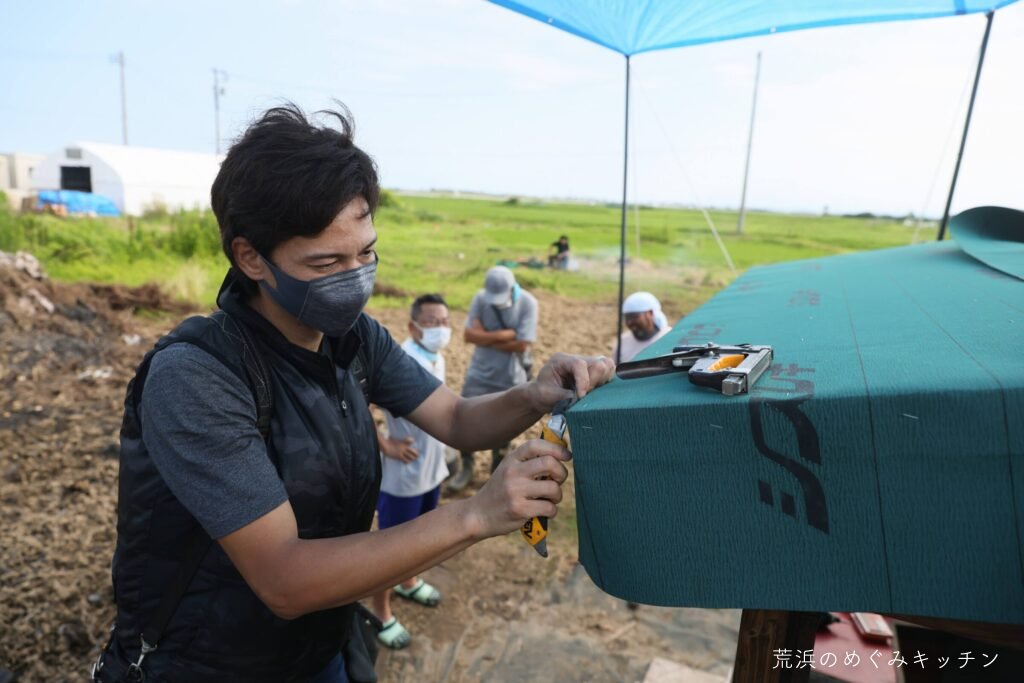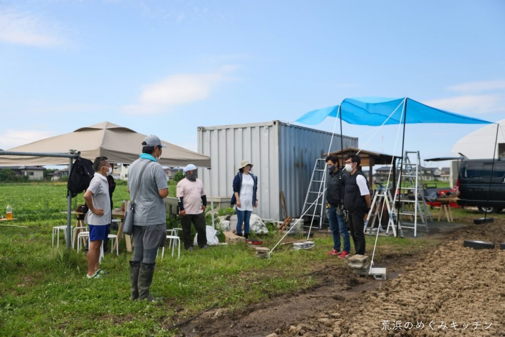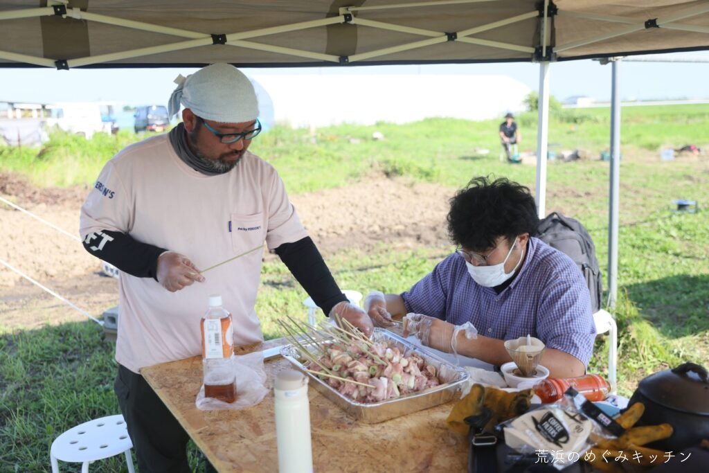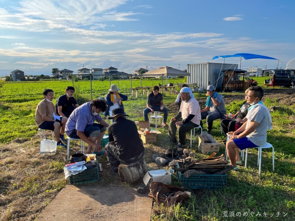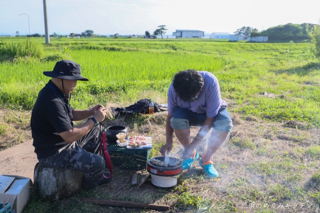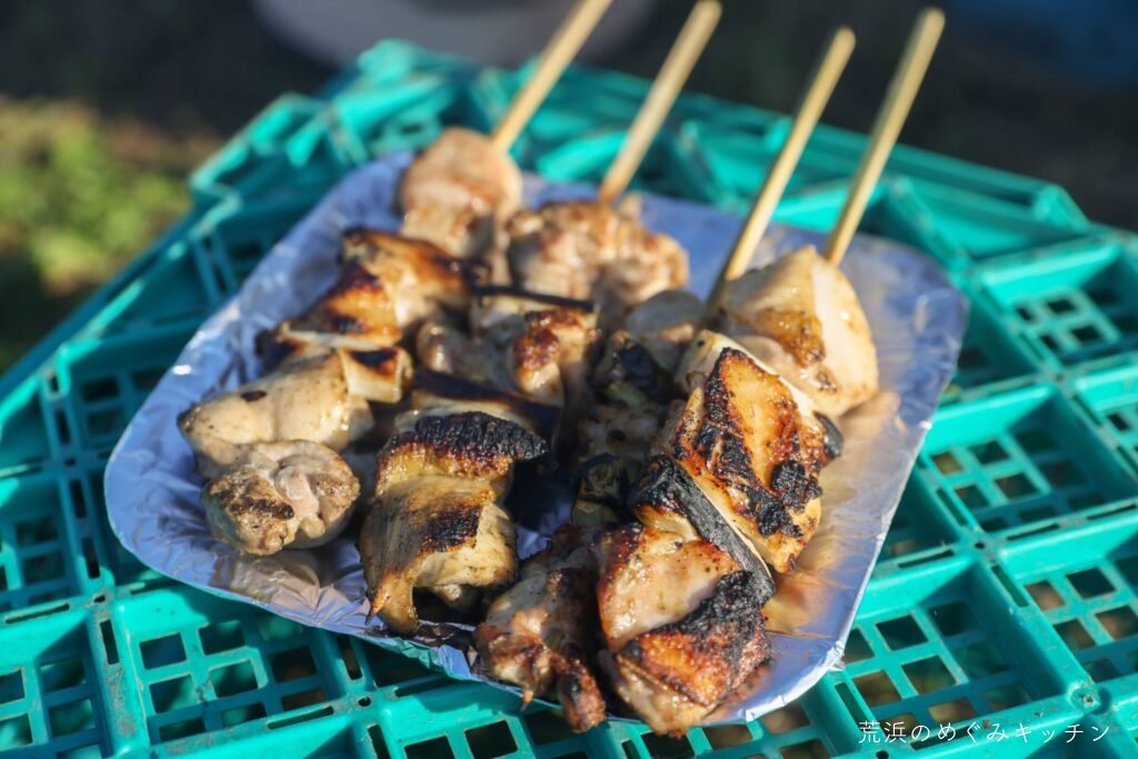 本日のおまけは、荒浜の塩を使った焼き鳥。汲んできた荒浜の海水を煮詰めて塩を作り、炭火焼きの美味しい焼き鳥が完成。作業の後にみんなで焚き火を囲みながら、ゆったり談笑の時間となりました。