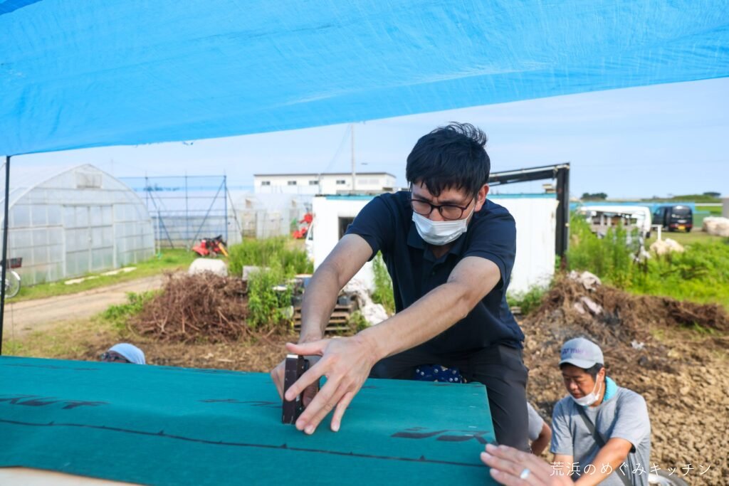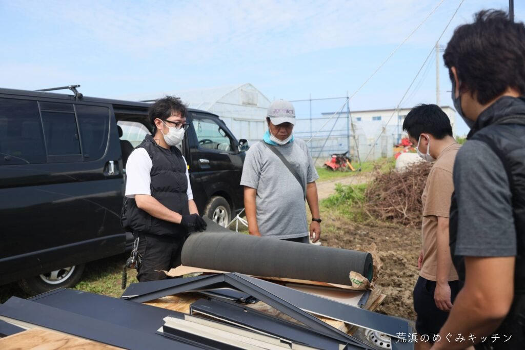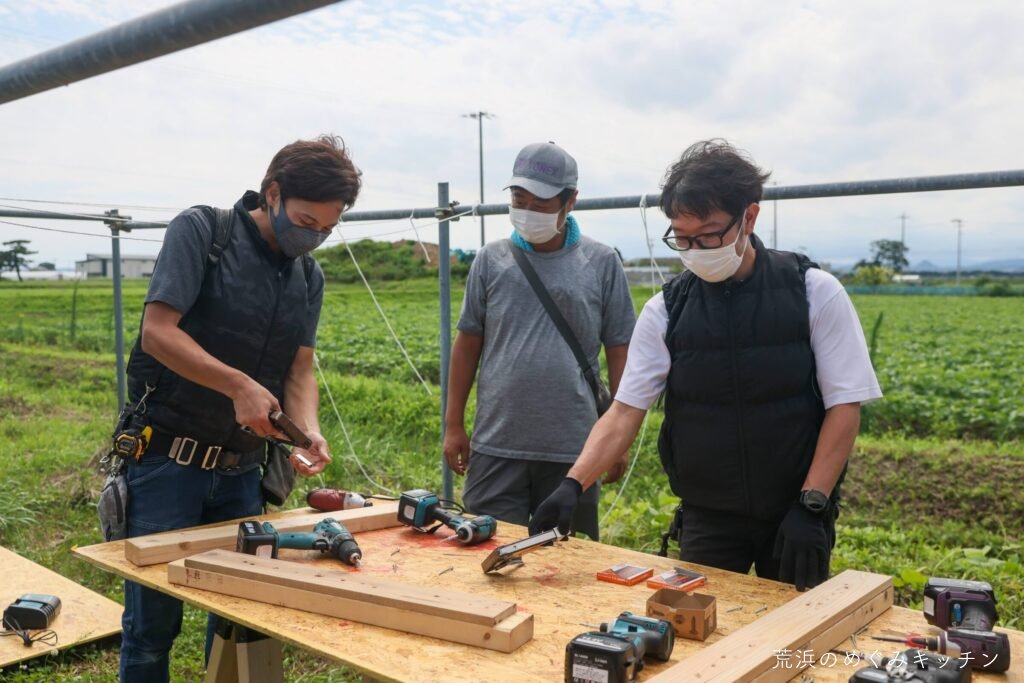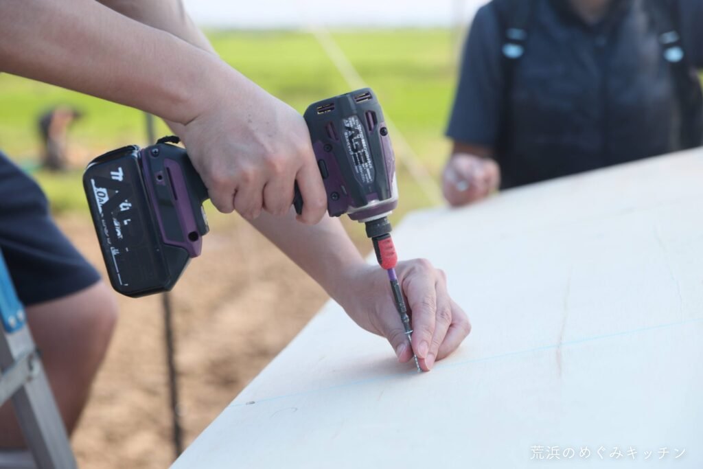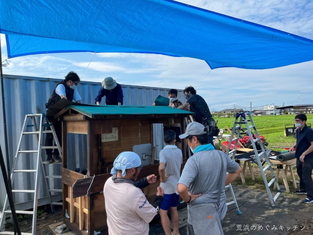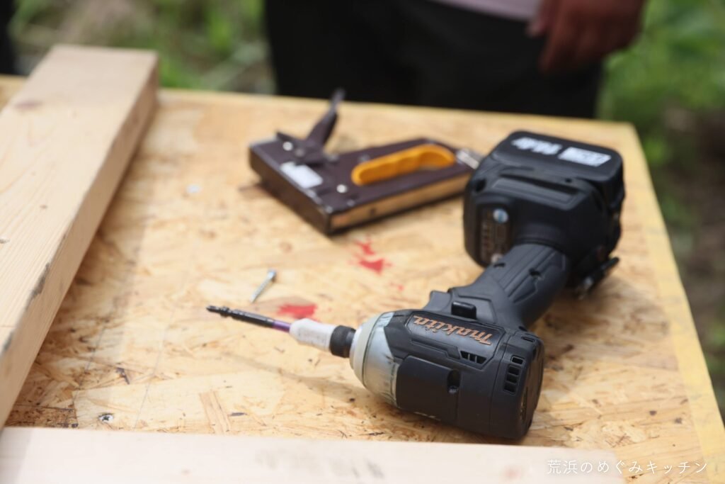 今日の作業は屋台の屋根の葺きなおし。今回もスリーエイトの職人さんにお越し頂いて、まずはインパクトドライバーやタッカーの講習からスタート。