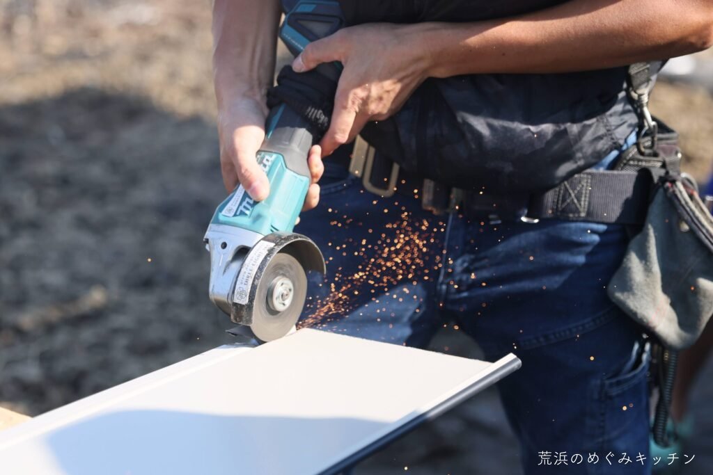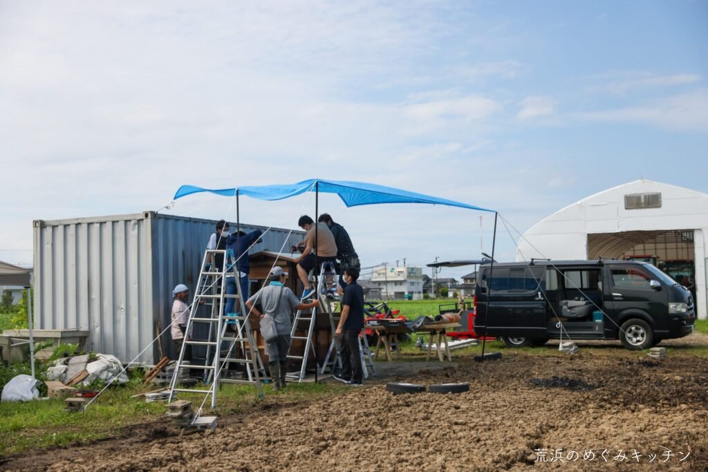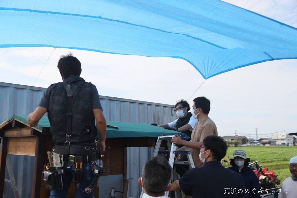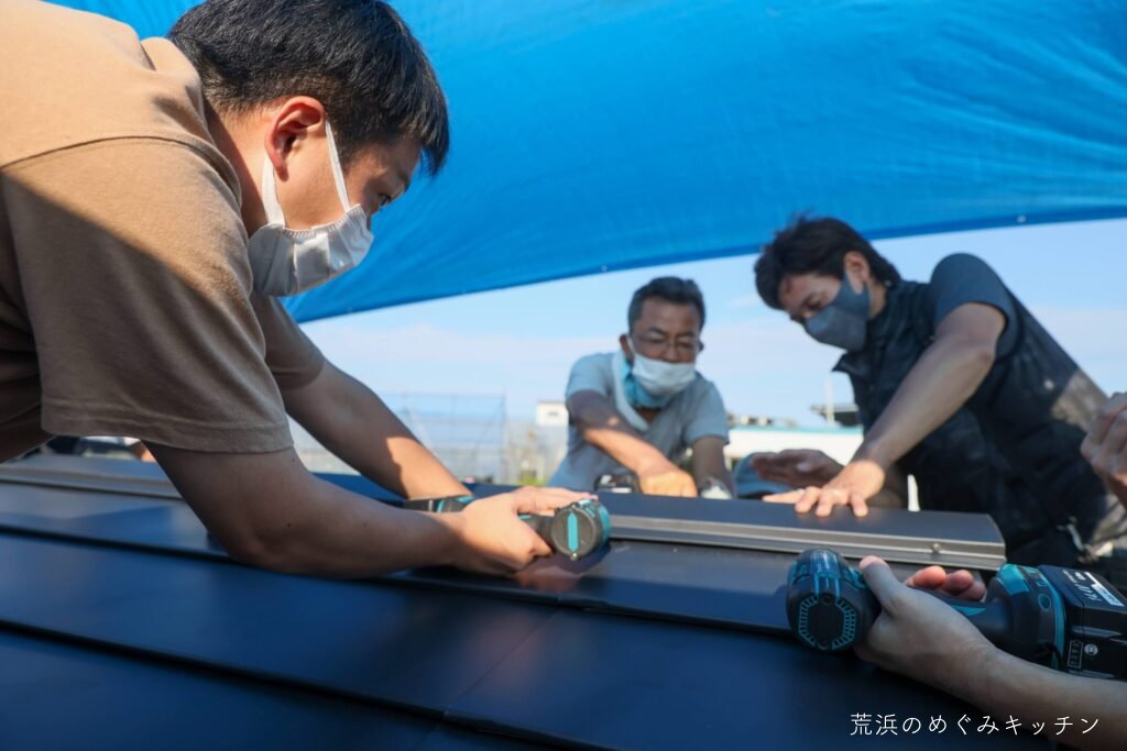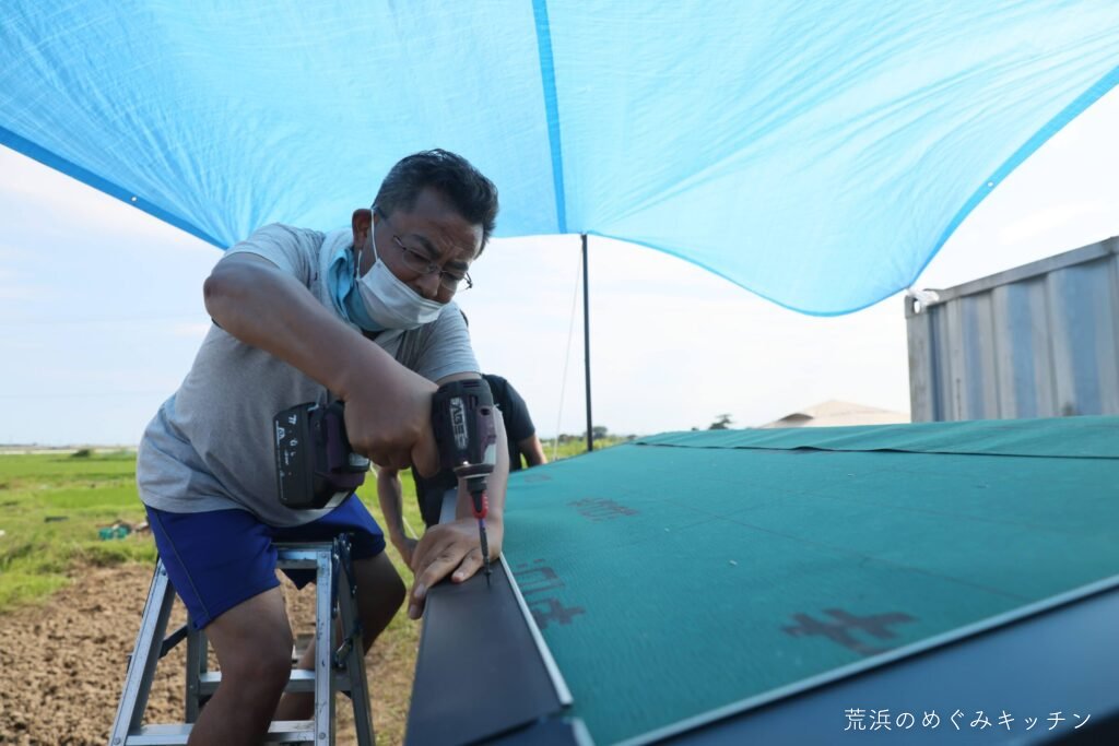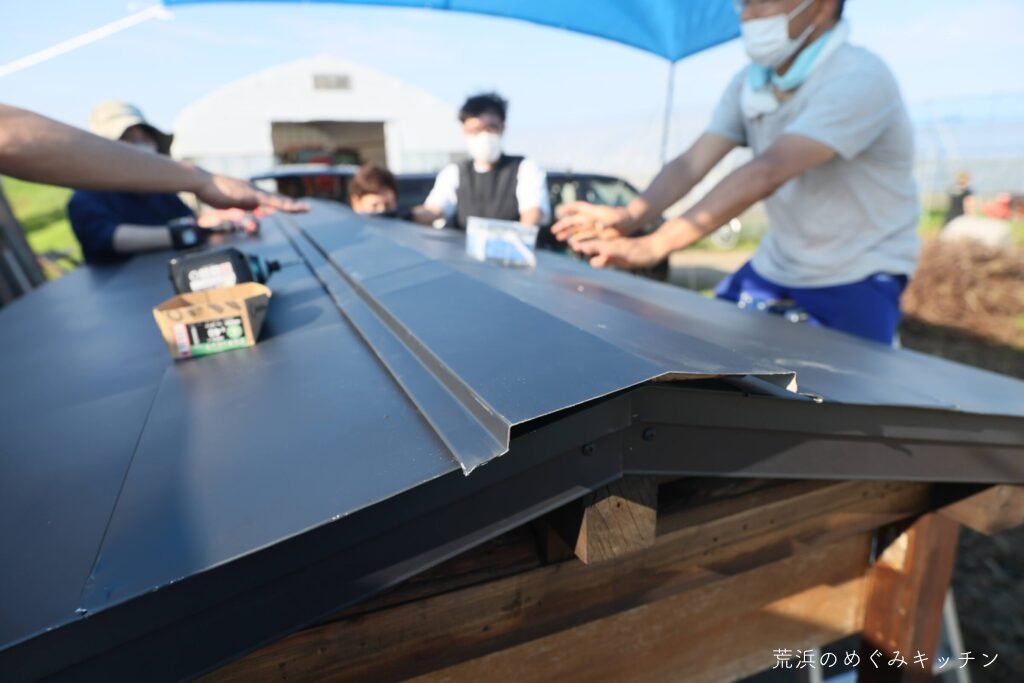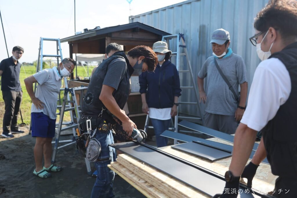 最後にトタン板を取り付け。足りない部材もその場でカットしながら、着々と仕上がっていき、屋根の完成となりました。