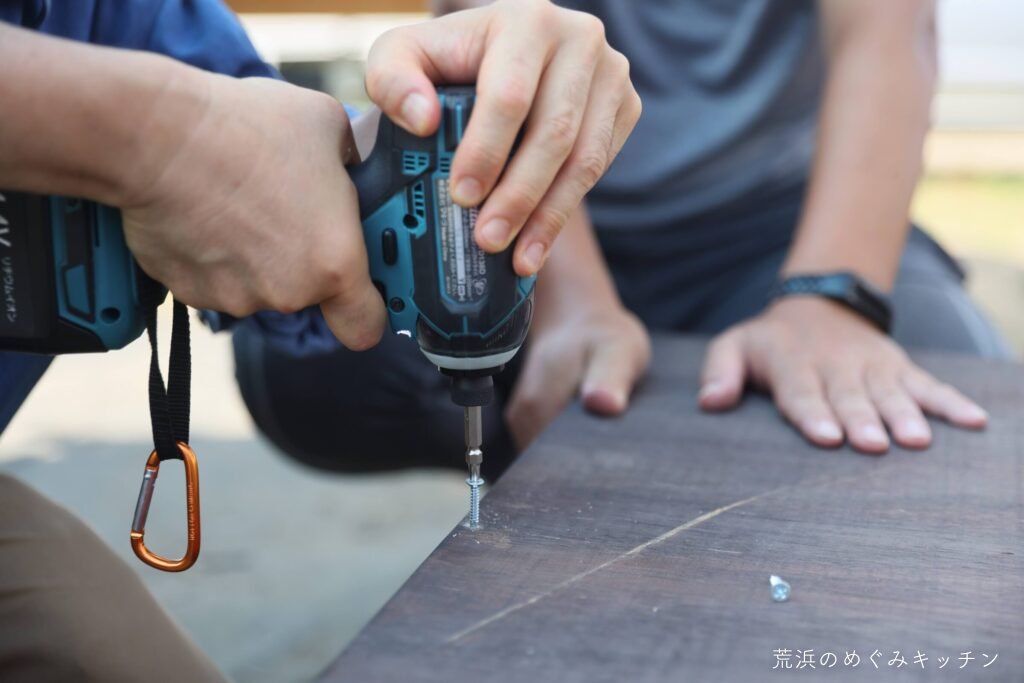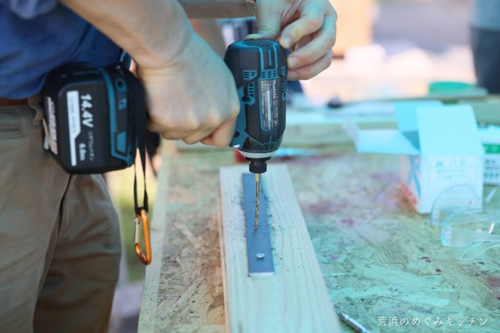 塗料を乾かす間に、前回に引き続きインパクトドライバー講習。今回は金属板にビスを通すため、難易度が少し上がります。工具を垂直に合わせることの重要性もさらに上がる。