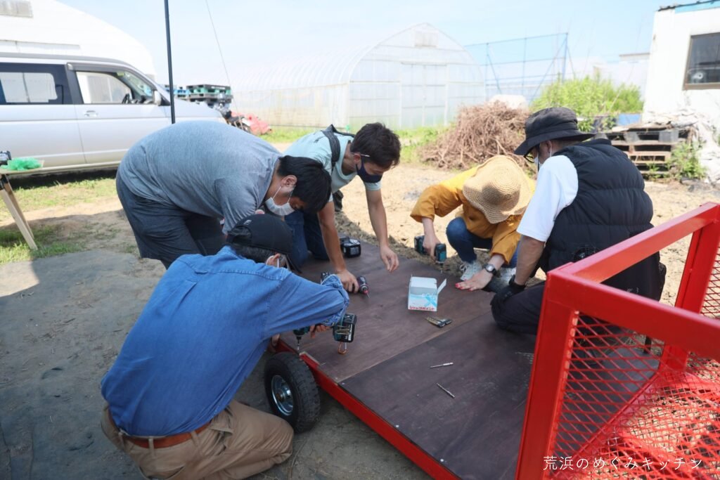 まずは台車に底板を取り付け。作業をしながら、参加者の腕がだんだん上がっていきます。