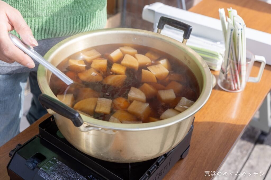 海岸公園センターハウスを会場に、ワークショップで修繕した屋台を持ち込んでトークイベントを開催しました。喜楽(屋台)がおでん屋さんだったことにちなみ、会場ではおでんのお振る舞いも。