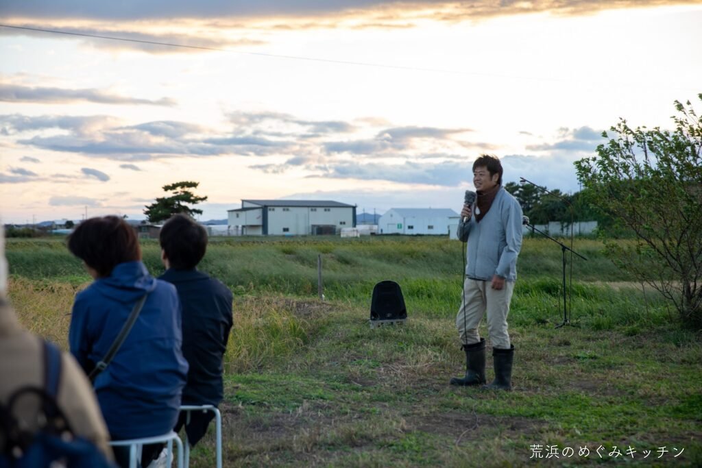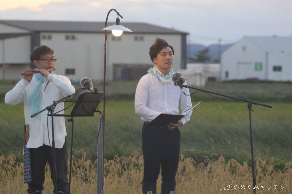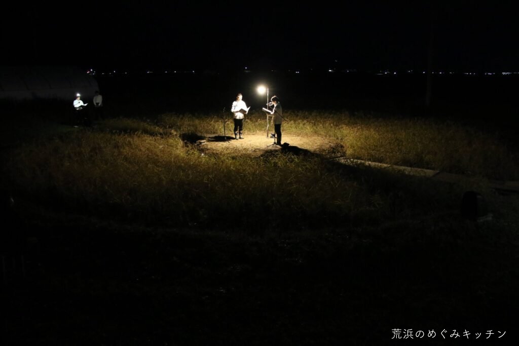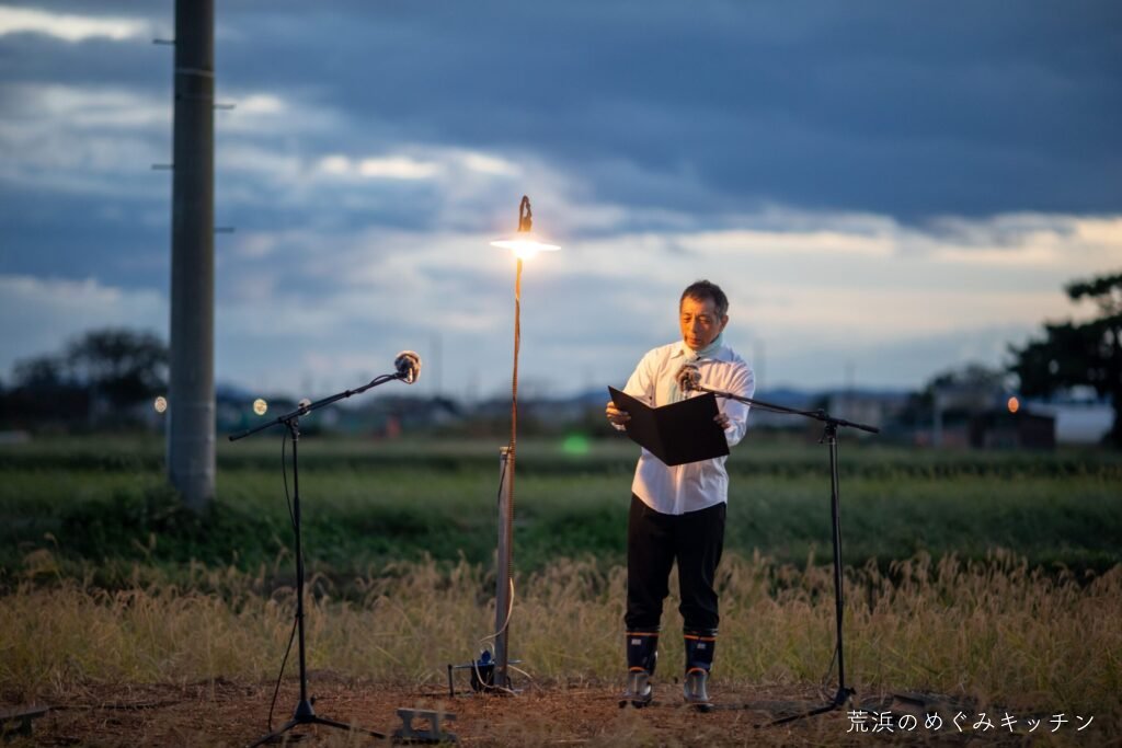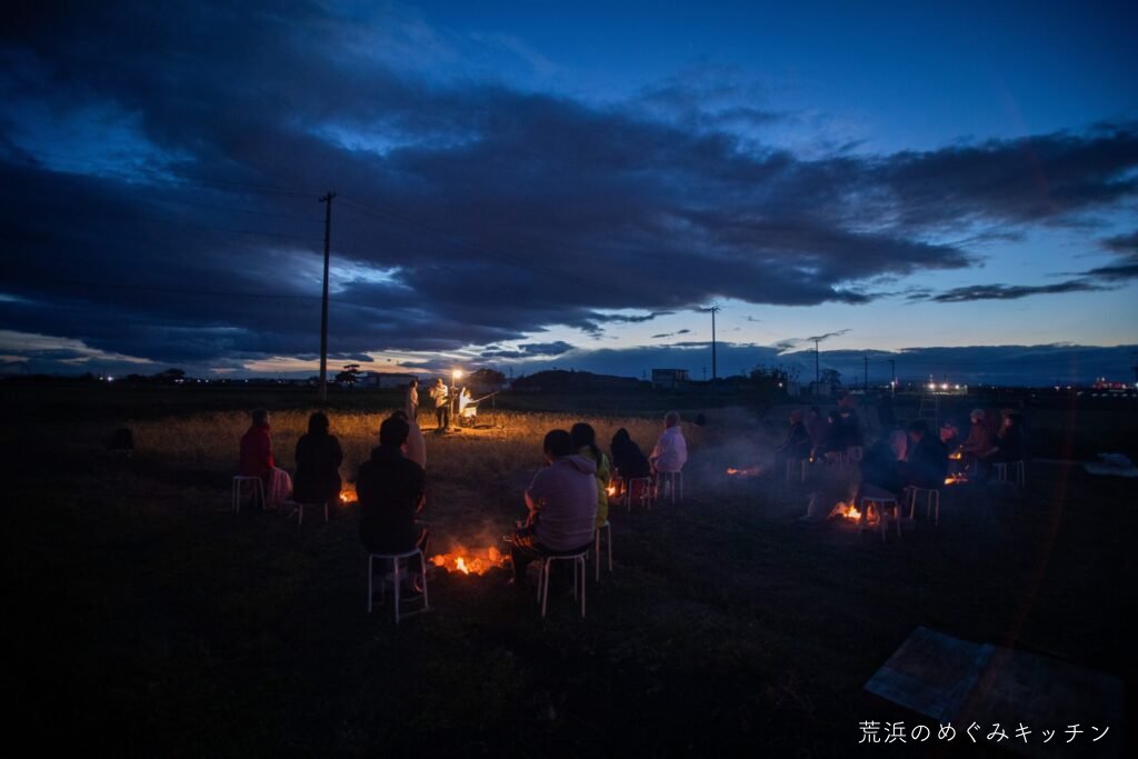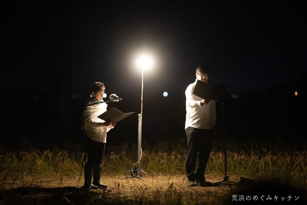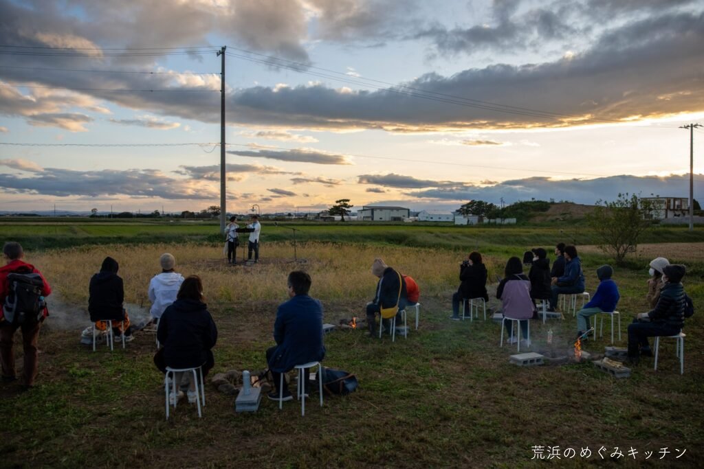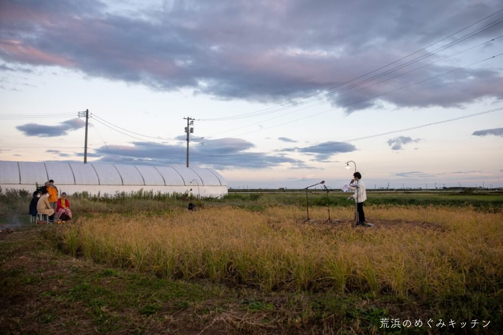 荒浜ベースの丸い田んぼを舞台に、荒浜の夕景を背景にした朗読会「賢治と焚き火と丸い田んぼ」を今年も開催しました。