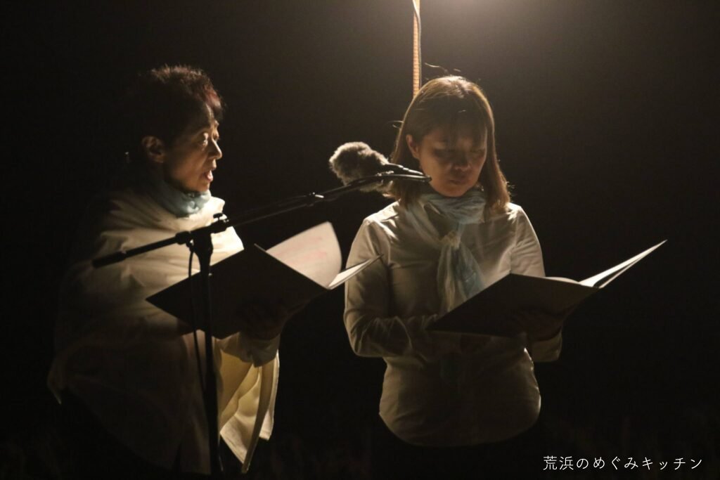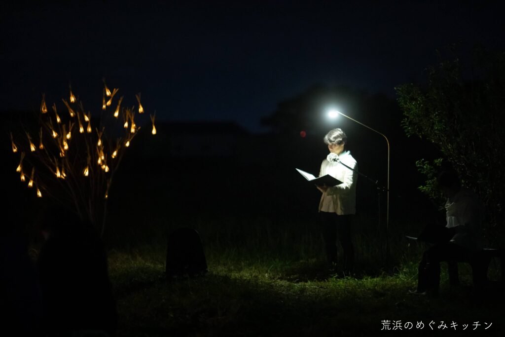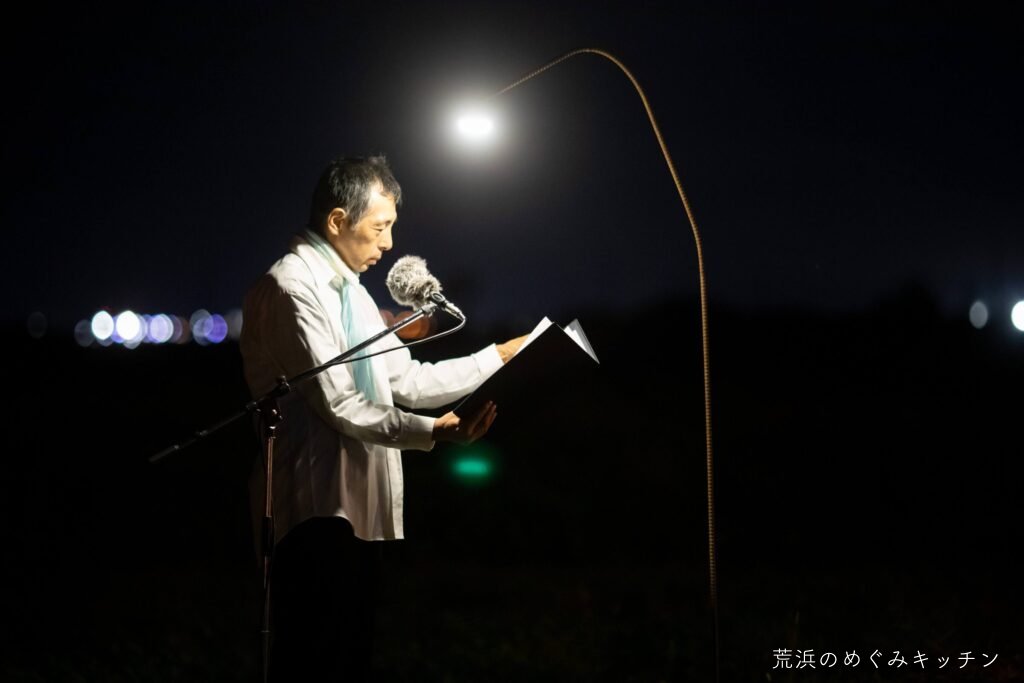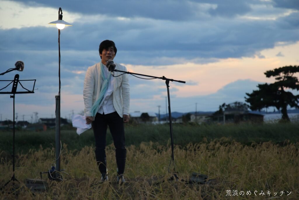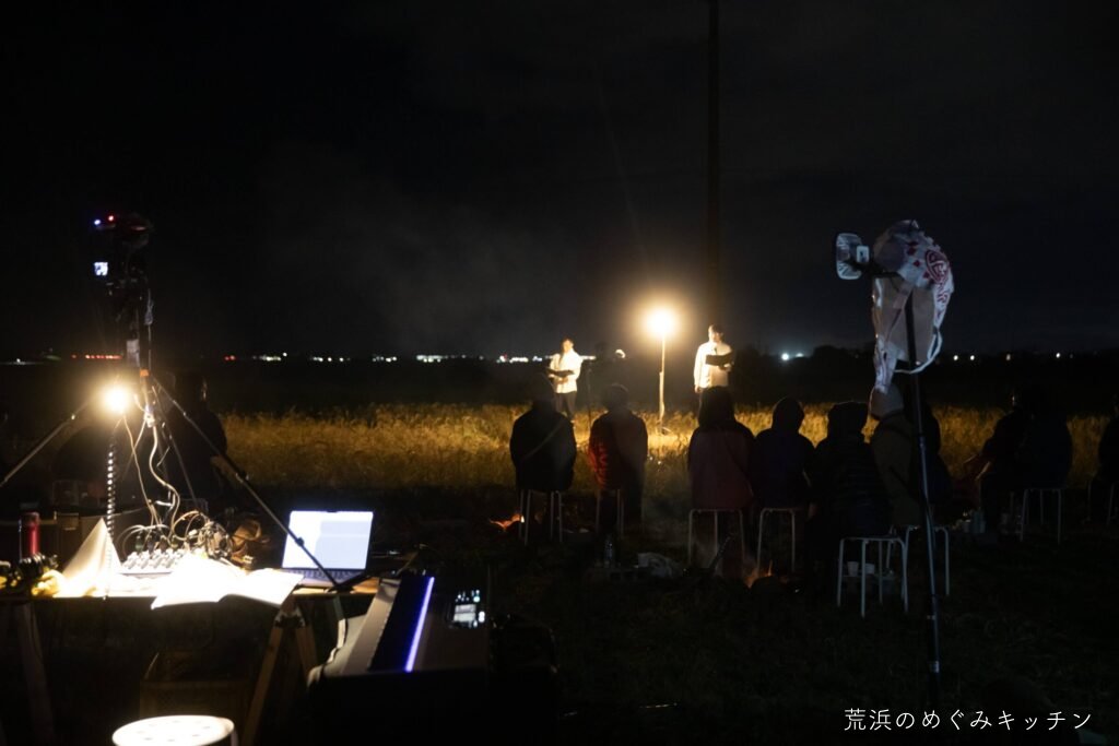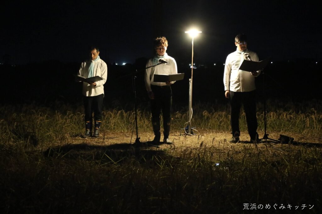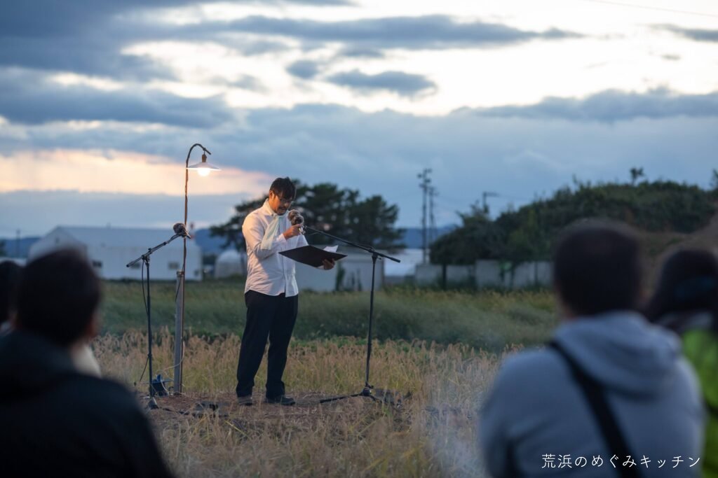 荒浜ベースの丸い田んぼを舞台に、荒浜の夕景を背景にした朗読会「賢治と焚き火と丸い田んぼ」を今年も開催しました。