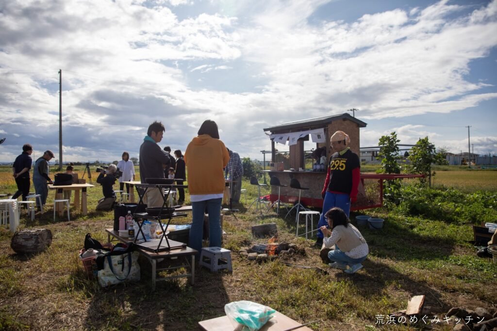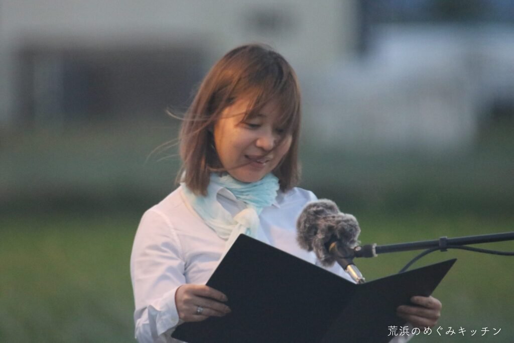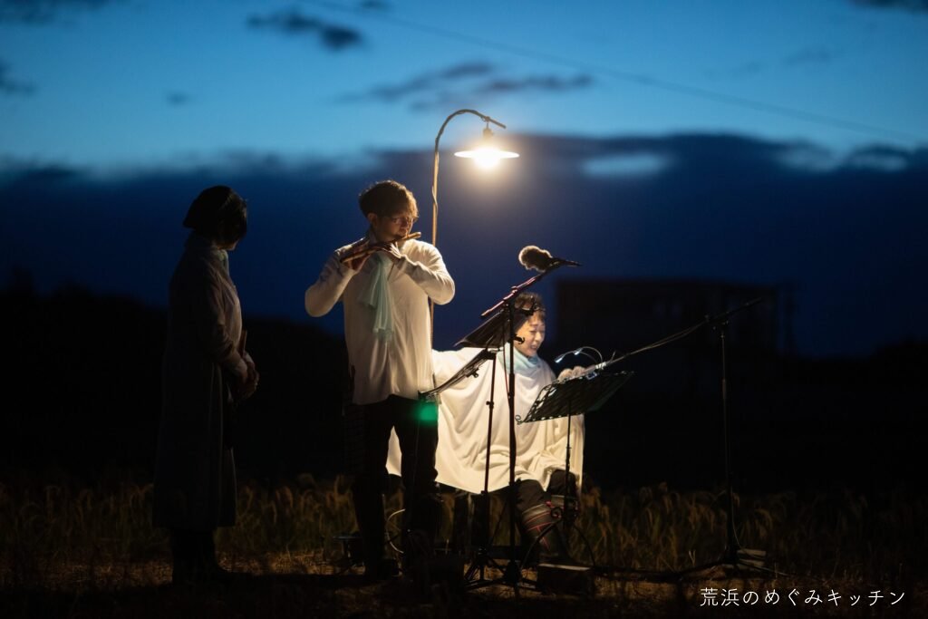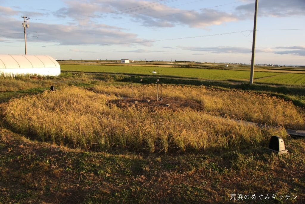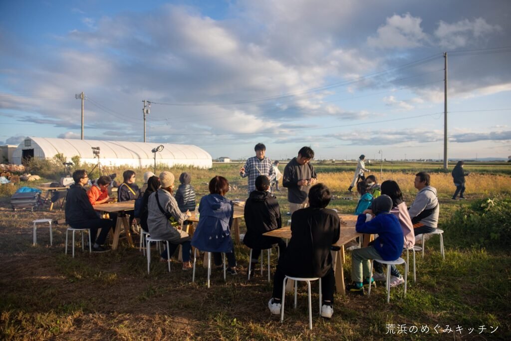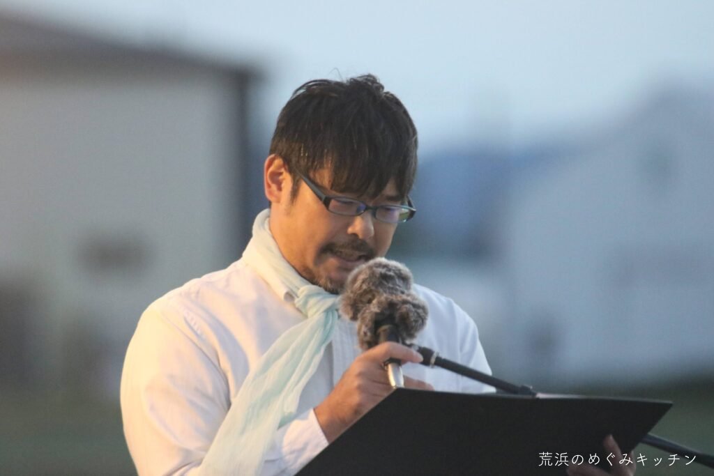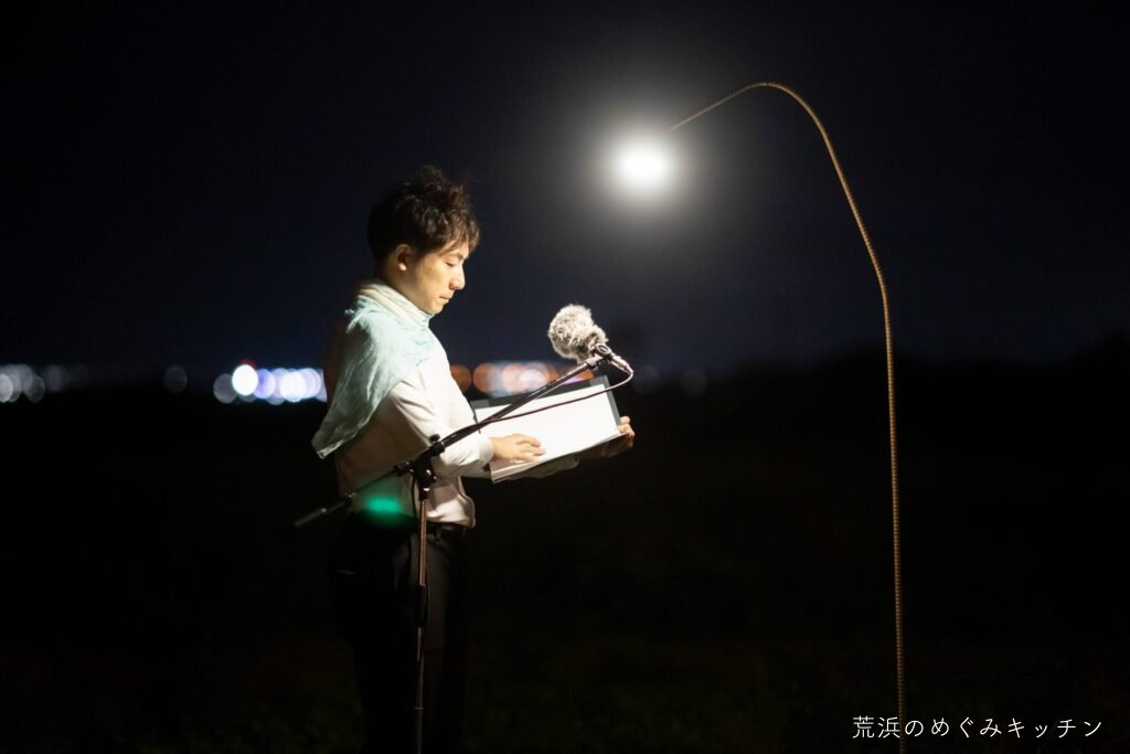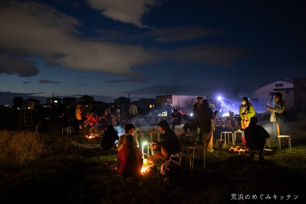 荒浜ベースの丸い田んぼを舞台に、荒浜の夕景を背景にした朗読会「賢治と焚き火と丸い田んぼ」を今年も開催しました。