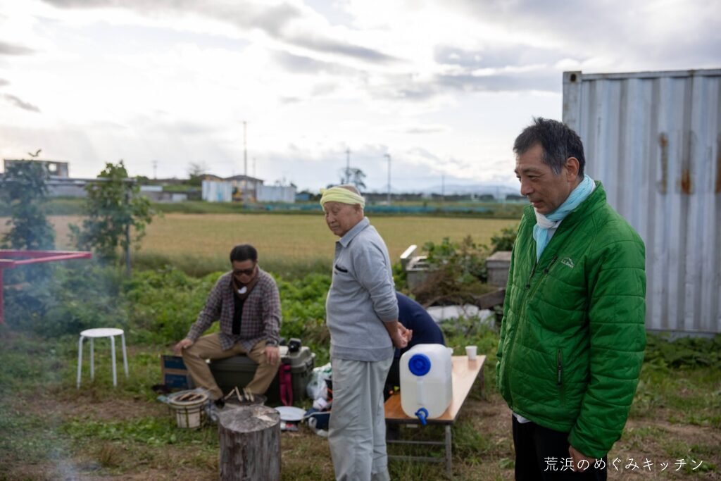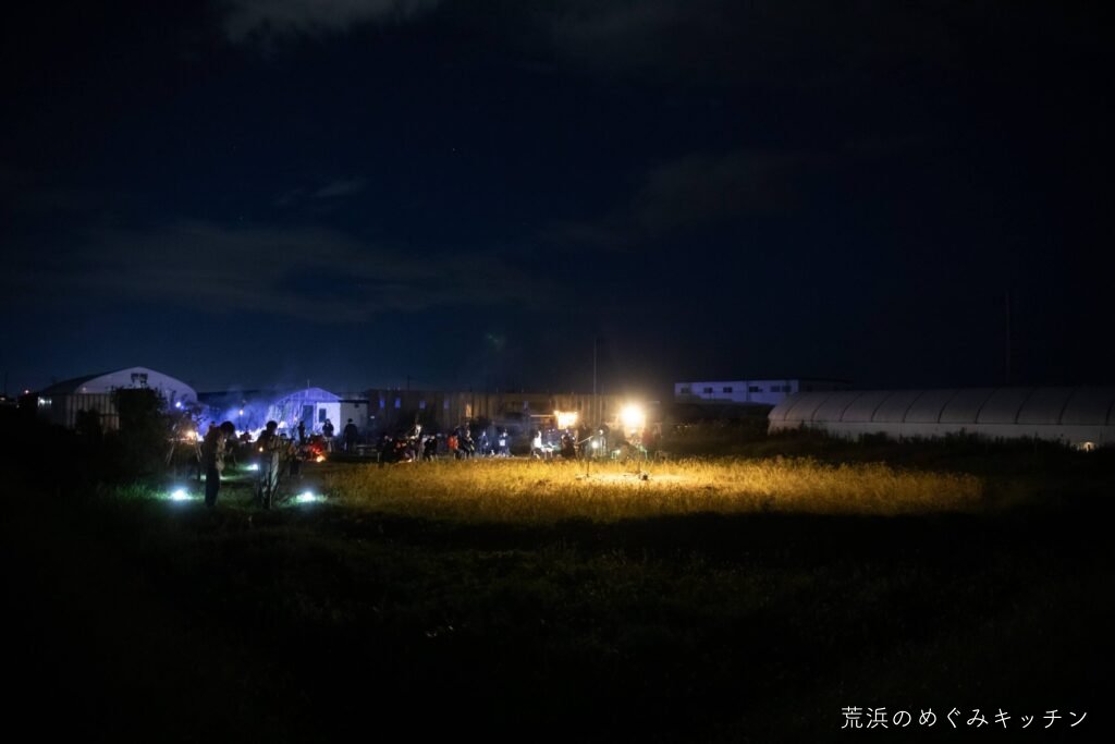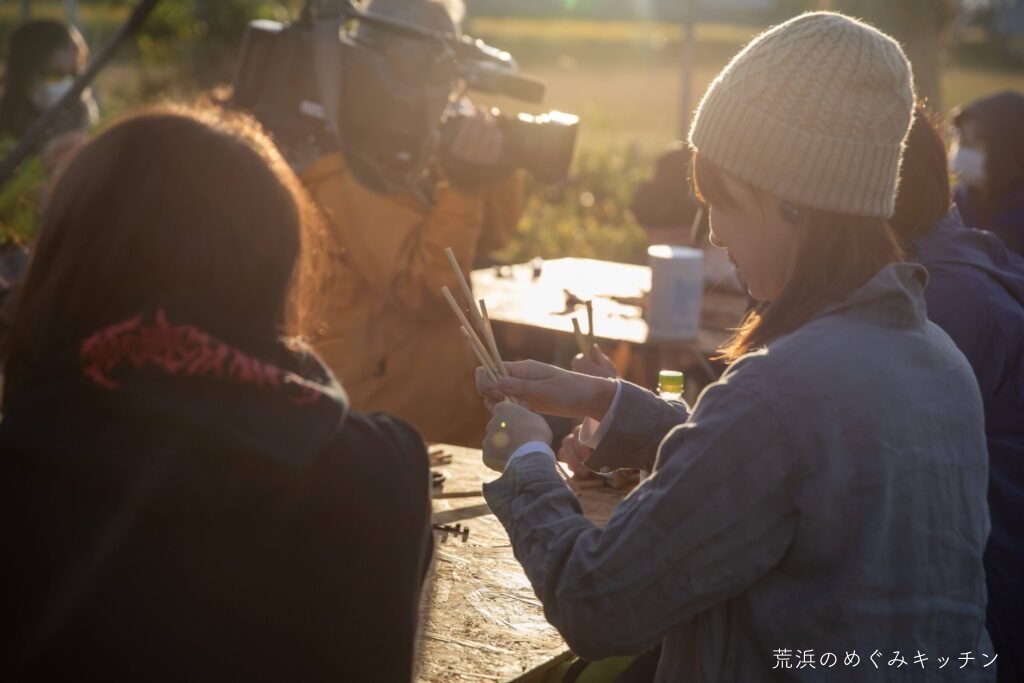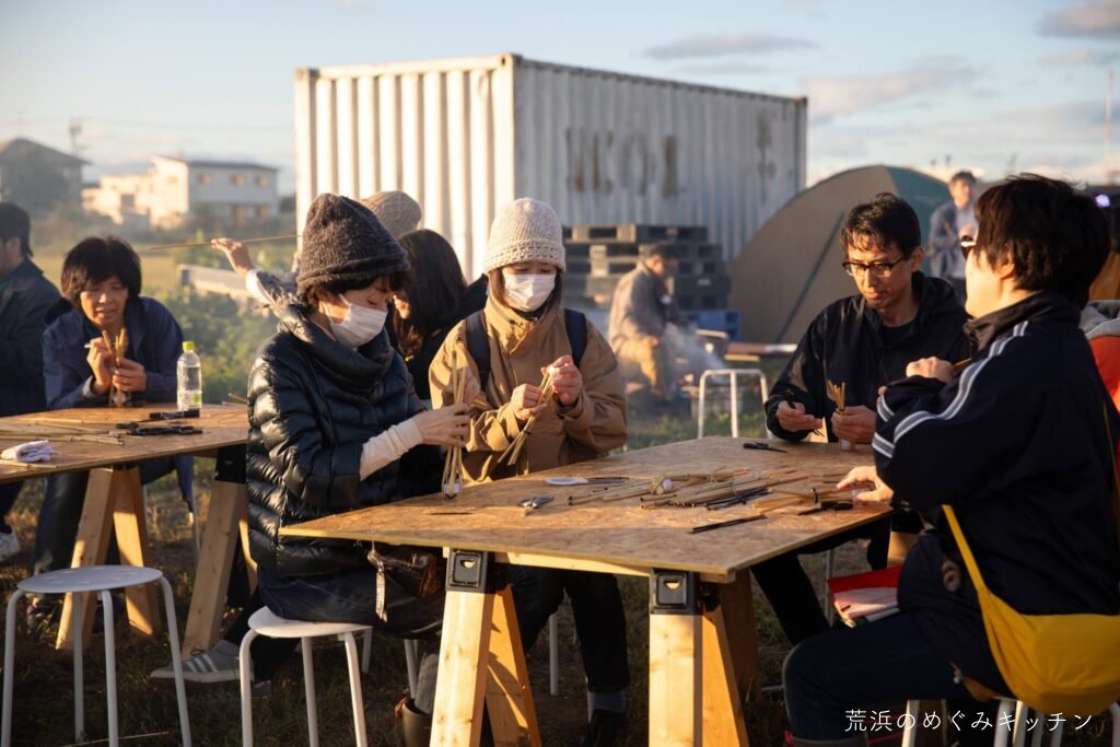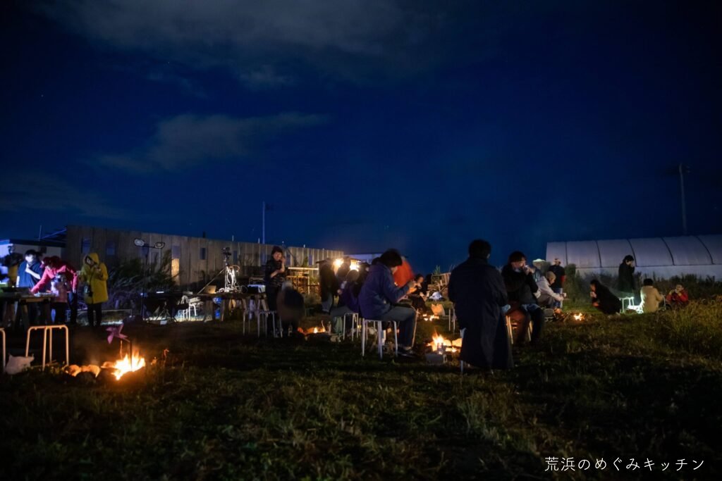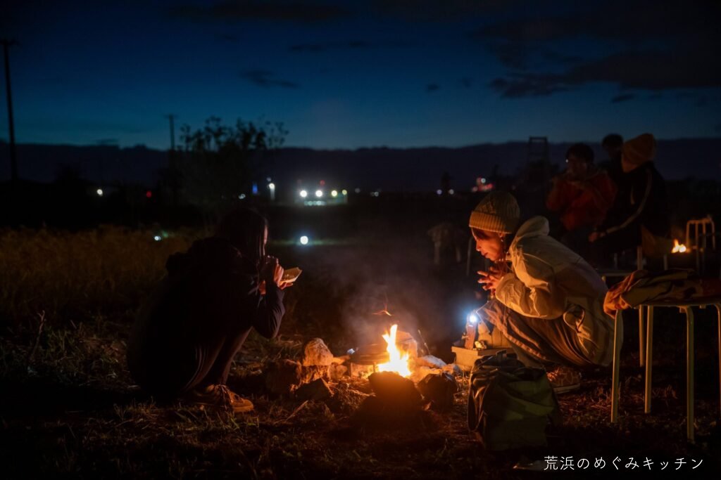 ここで夕食のひととき。荒浜産の食材を活かした軽食を、焚き火で軽く調理しながらいただきます。事前に用意した里芋が焼けすぎてしまいやり直すハプニング(笑)がありましたが、美味しく食べてもらえていたら何より。