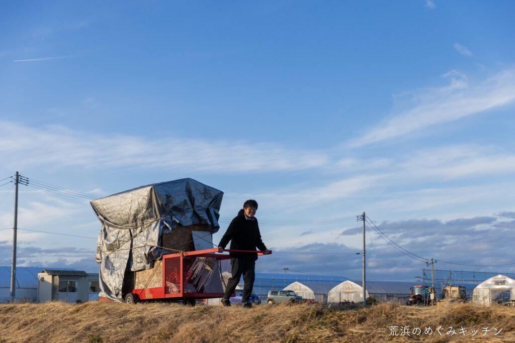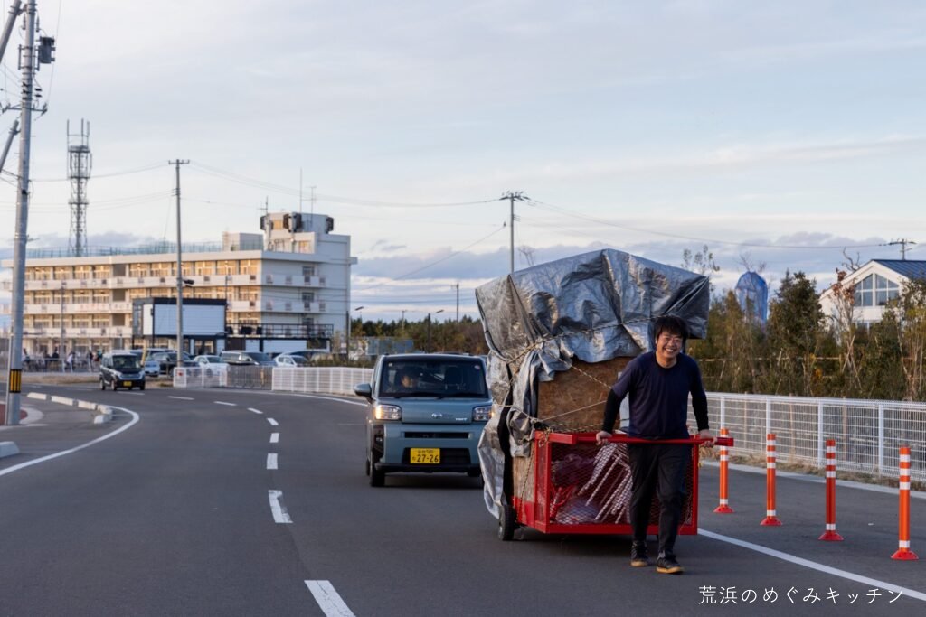 こちらは事前準備として、屋台を海辺へ移動したときの様子。写真はひとりで引いている瞬間ですが、実は結構重いので3人がかりで運んでいます(本当は4人欲しいところ)。