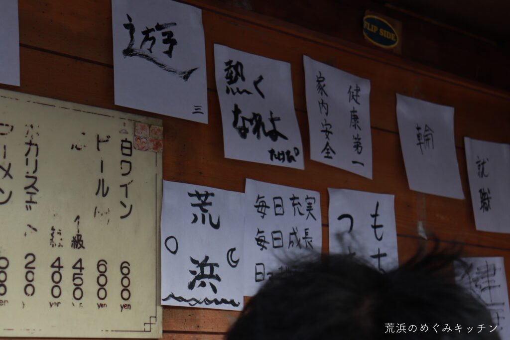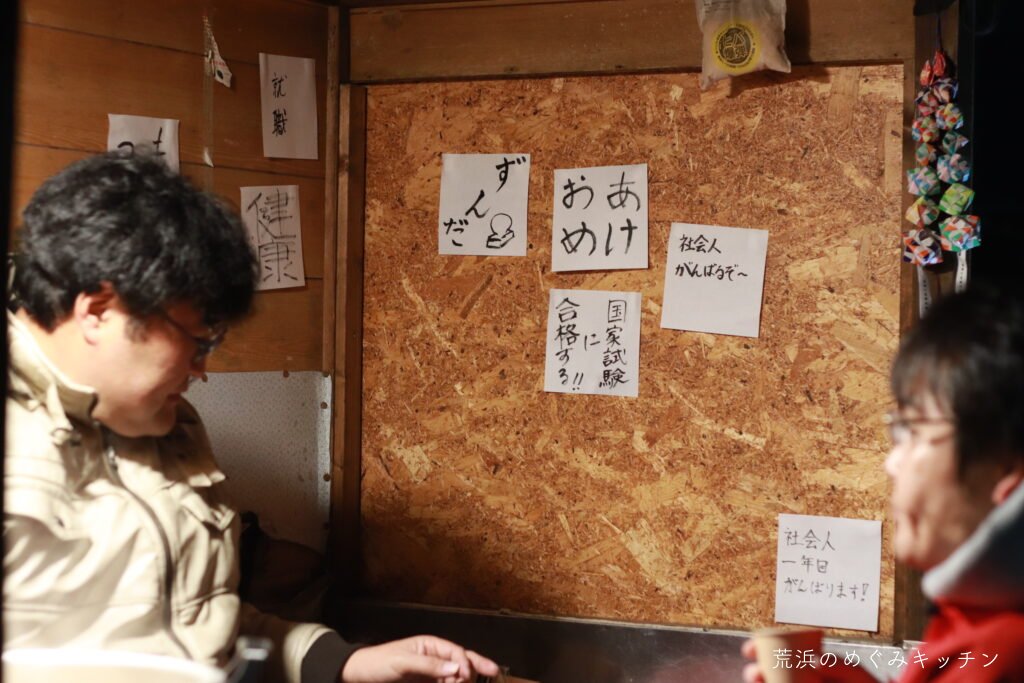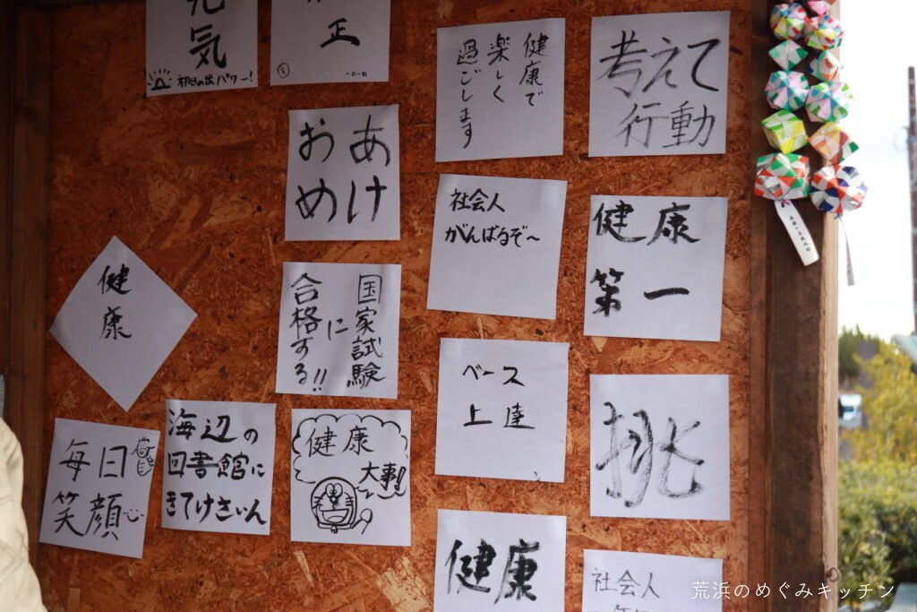 日の出の後もおふるまいは続きます。書き初めの数が増えていき、屋台の壁に貼られた様はまるで絵馬のようでした。
